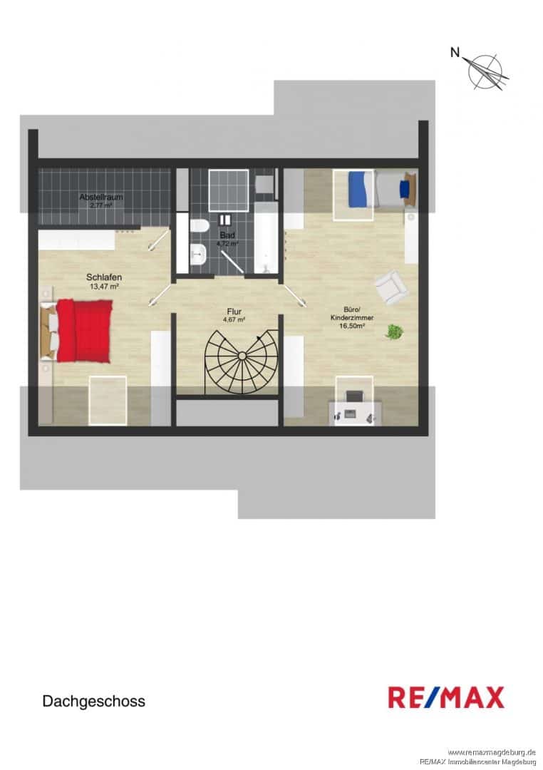Über eine innenliegende Wendeltreppe erreichen Sie das Dachgeschoss, das als privater Rückzugsbereich dient. Hier stehen ein Schlafzimmer mit ca. 13,47 m² sowie ein weiteres Zimmer mit ca. 16,50 m² zur Verfügung, das flexibel als Homeoffice, Gäste- oder Hobbyraum genutzt werden kann. Ein praktischer Abstellraum sorgt für zusätzlichen Stauraum. Das zweite Badezimmer ist als Wannenbad ausgeführt und bietet Platz für eine Waschmaschine. Dachflächenfenster sorgen für viel Tageslicht und unterstreichen den luftigen Charakter dieser Ebene.