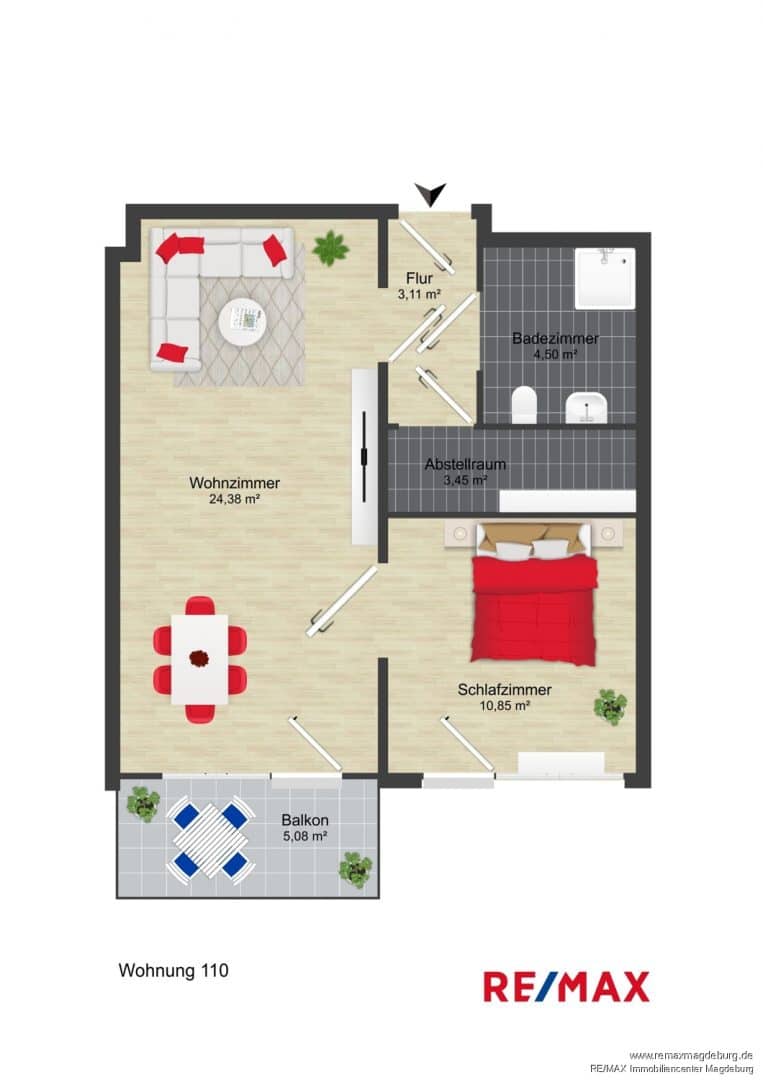 Beim Betreten der Wohnung gelangen Sie in den zentralen Flur, von dem aus Sie direkt zur Wohnküche, dem Badezimmer sowie einem praktischen Abstellraum gelangen. Alle Bereiche sind bequem und barrierefrei erreichbar.