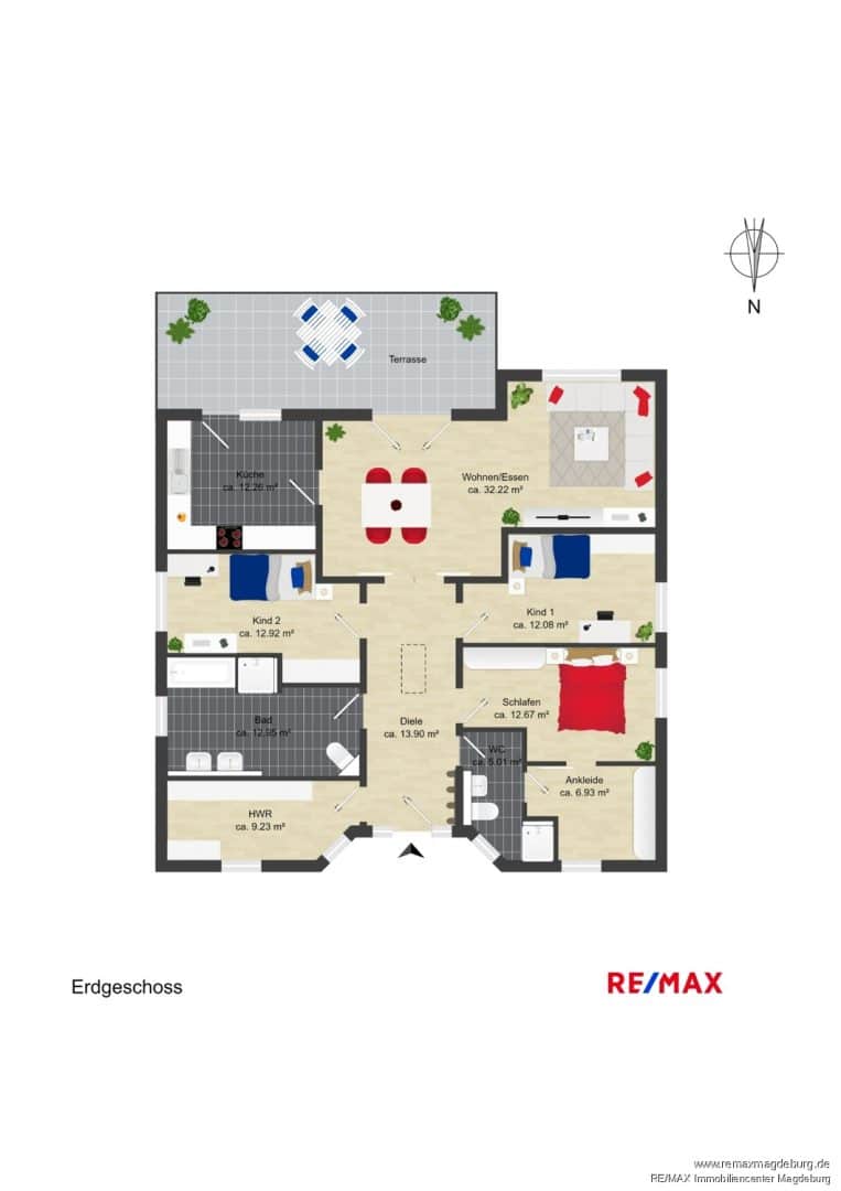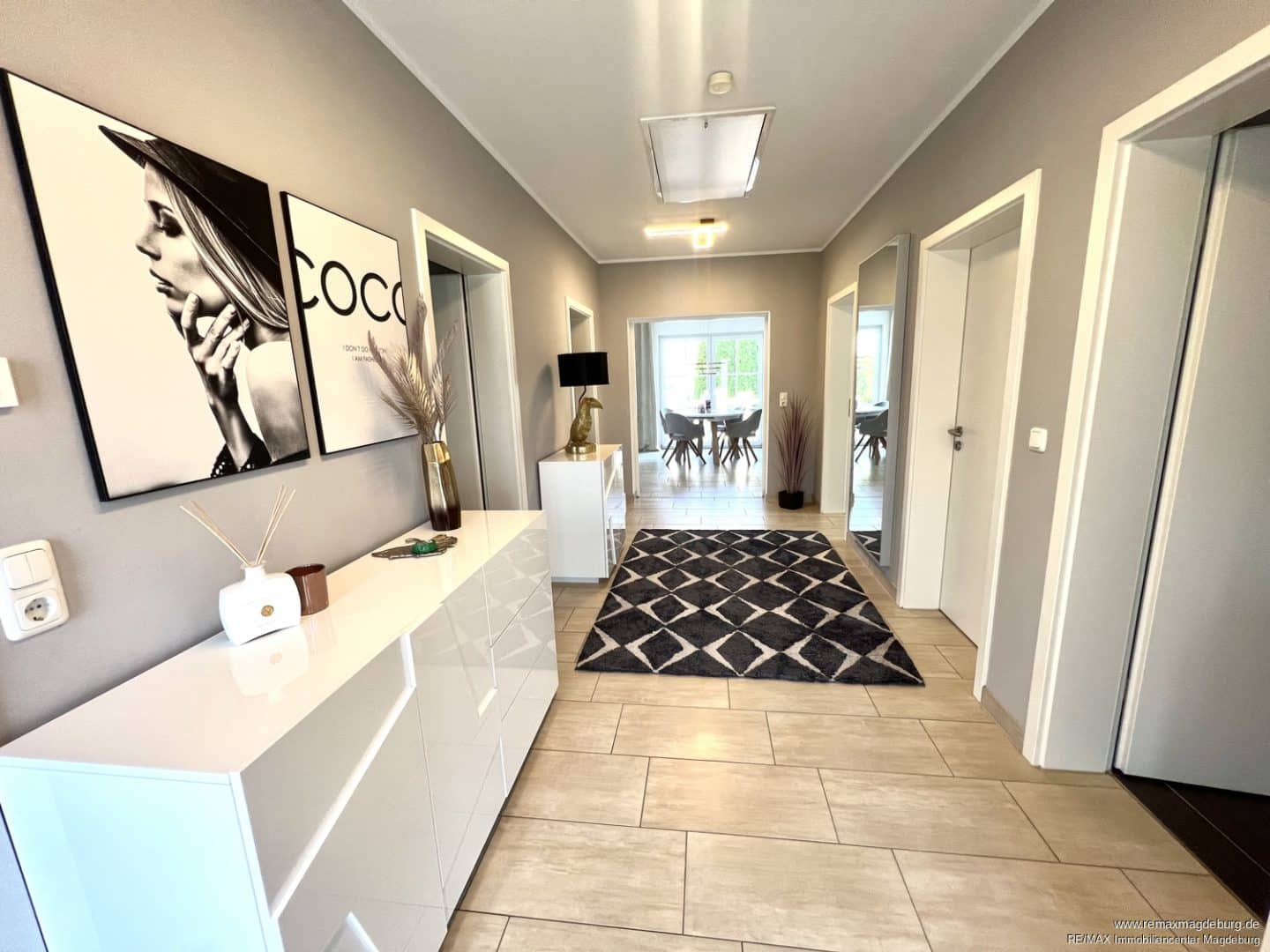 Des Weiteren erreichen Sie über den Eingangsbereich das große Badezimmer, ausgestattet mit Wanne und Dusche, das Gästebad, einen Hauswirtschaftsraum und zwei weitere Schlafzimmer. Die Küche wird über das Wohn- und Esszimmer erreicht.