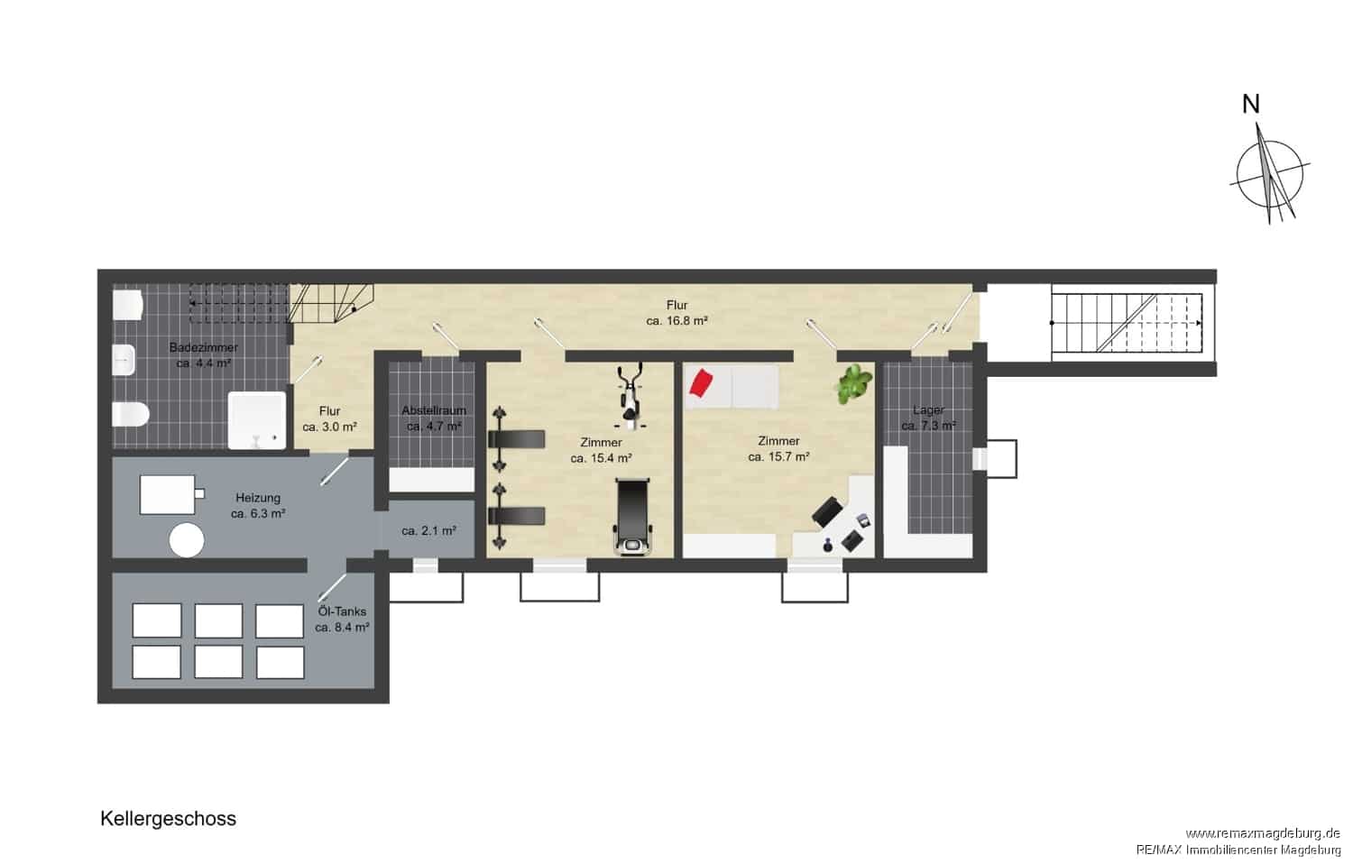 Der große Keller beherbergt neben dem Heizungsraum, zwei Abstellräume und zwei weitere Zimmer, die zusätzlichen Platz für Übernachtungsgäste oder Hobbys bereithält.