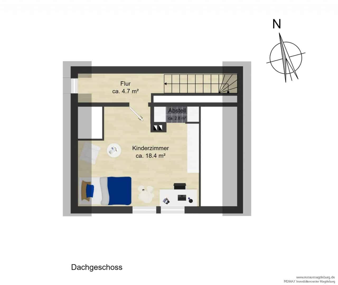 Das Dachgeschoss hält ein weiteres Schlafzimmer mit einer kleinen Abstellkammer bereit.