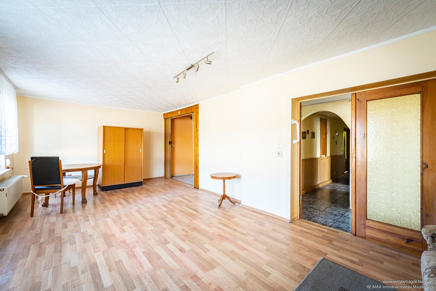 Vom Windfang gelangen Sie in den Flur, von dem das geräumige Wohnzimmer, ein Schlafzimmer, das Badezimmer mit Dusche und die großzügige Wohnküche abgehen. Die Küche bietet den Zugang zu einem weiteren Schlafzimmer.
