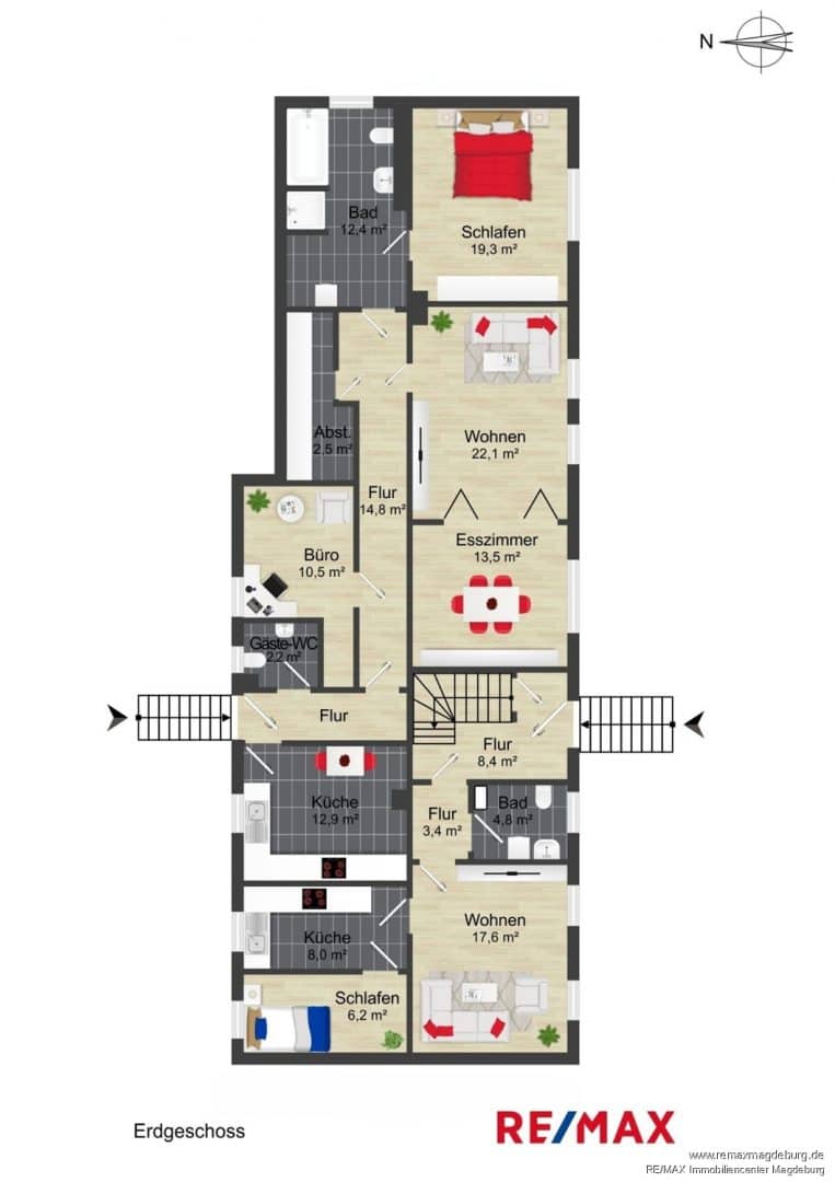 Ebenfalls im Erdgeschoss liegt Wohneinheit 2 mit ca. 110m² Wohnfläche, die über einen separaten Zugang vom ruhig gelegenen Hinterhof betreten wird. Diese großzügig geschnittene Wohnung verfügt über ein Gäste-WC, eine geräumige Küche, ein separates Büro, ein großen Wohn- und Essbereich, ein Tageslichtbad mit Wanne und Dusche sowie ein ruhig gelegenes Schlafzimmer.