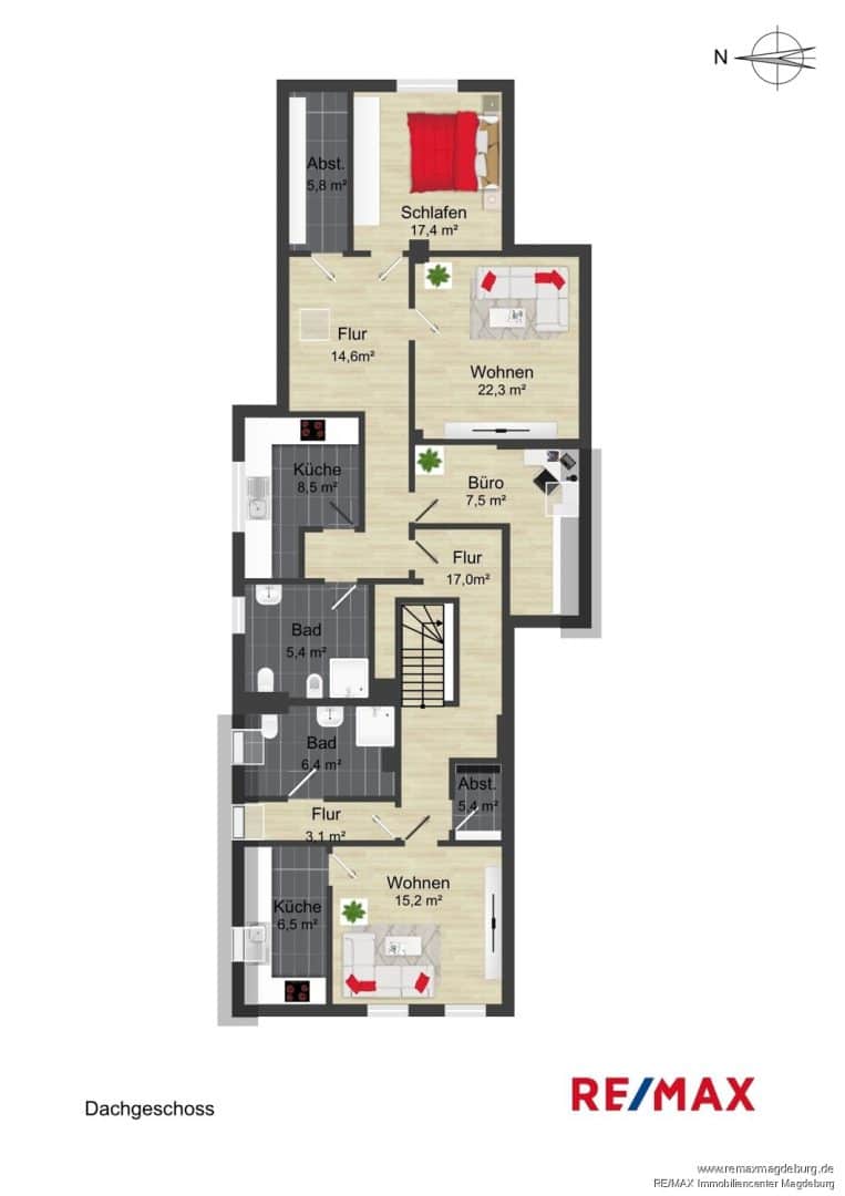 Im Dachgeschoss befinden sich die Wohneinheiten 3 und 4 befinden. Die kompakte mit ca. 37m² große Wohneinheit 3, aufgeteilt in ein Wohnzimmer, Küche und Tageslichtbad, eignet sich ideal für Einzelpersonen oder Pendler.
