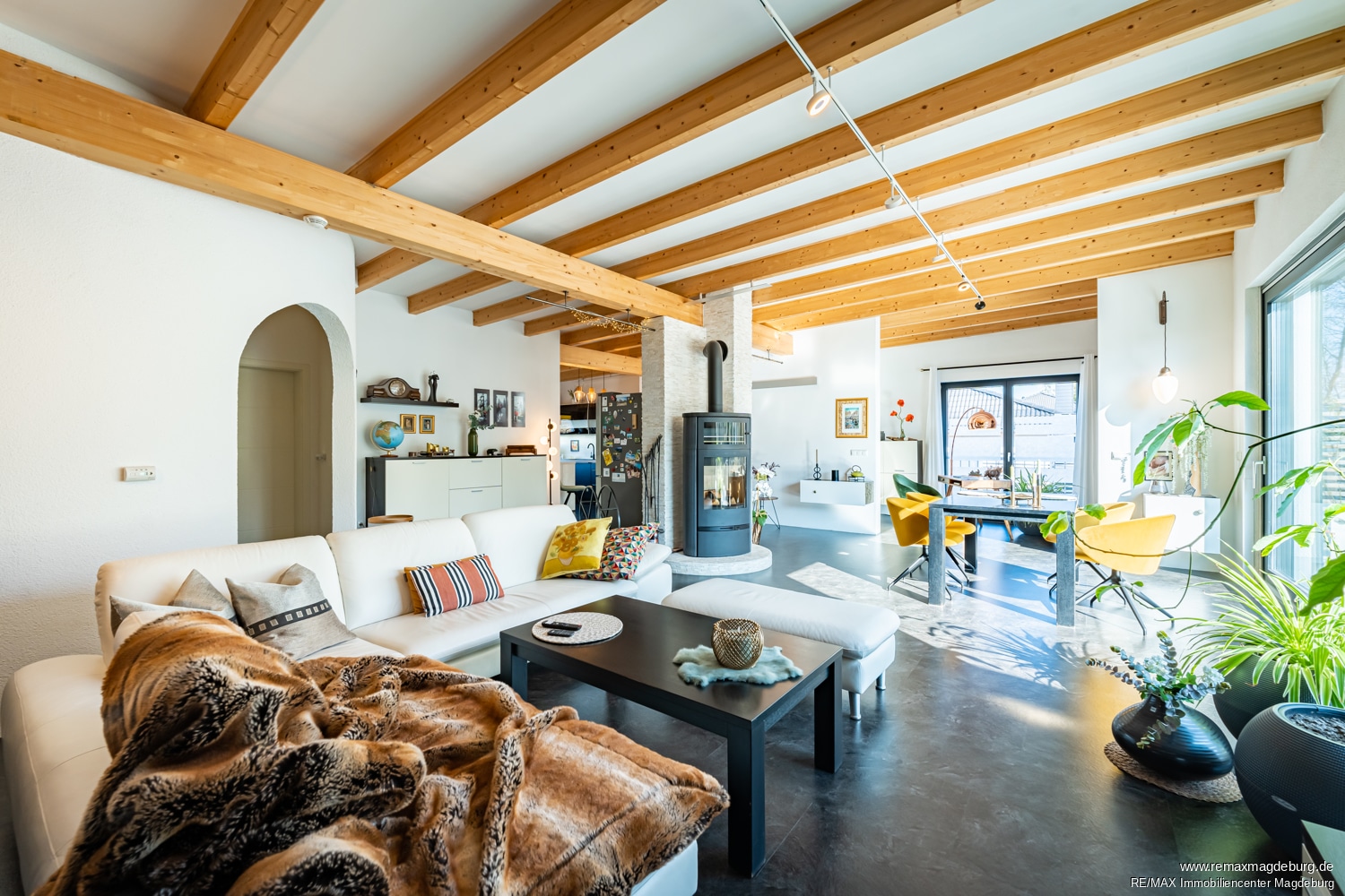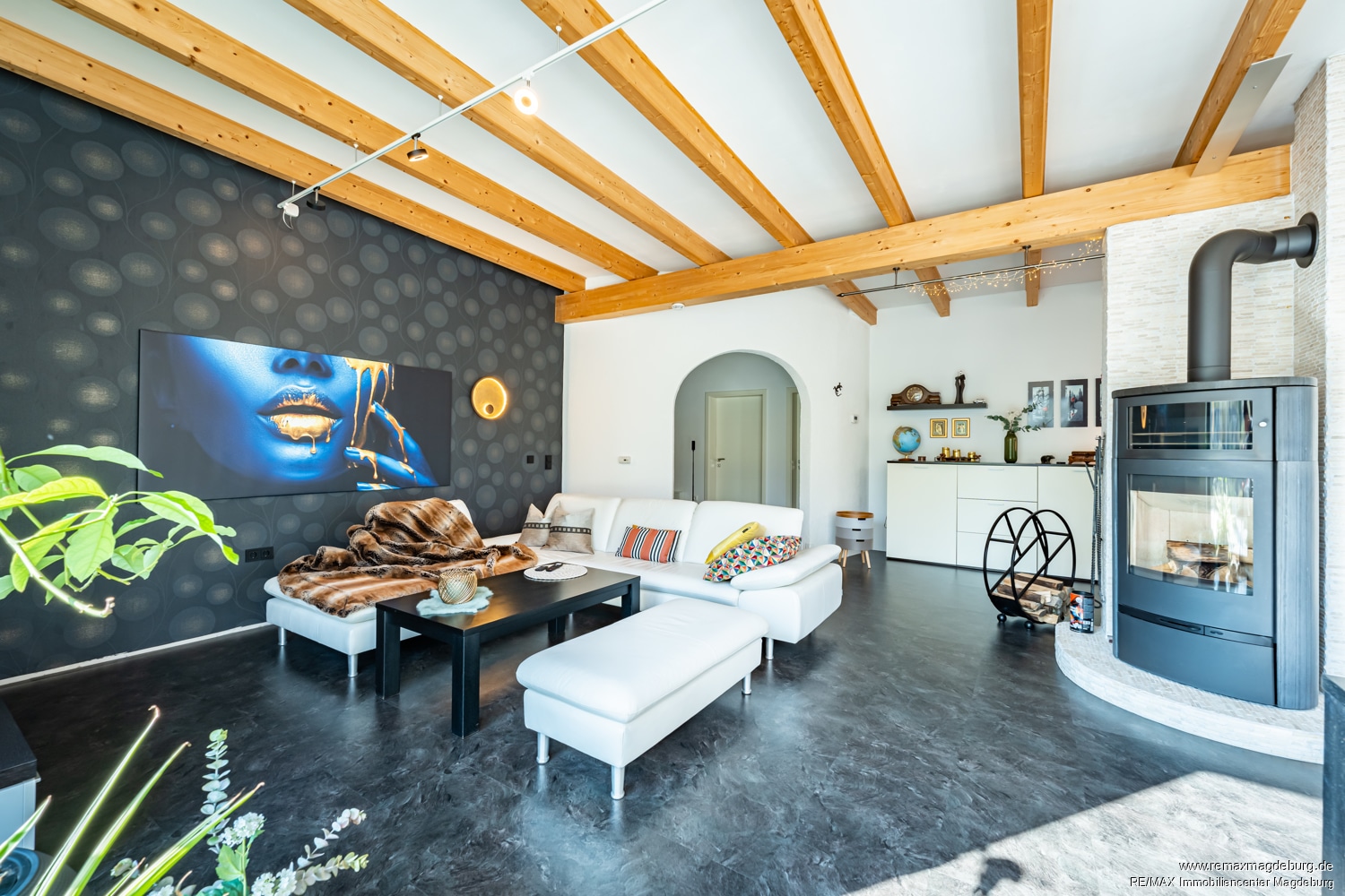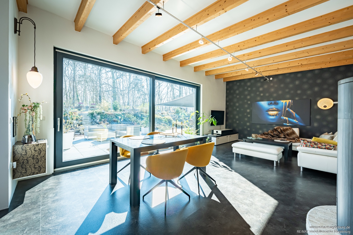 Das Herzstück dieses Hauses bildet der großzügige Wohn- und Essbereich mit Kamin. Große Fensterelemente durchfluten den Raum mit natürlichem Licht und schaffen eine harmonische Verbindung zwischen Innen- und Außenbereich. Der direkte Zugang zur Terrasse und dem Garten schafft eine offene, einladende Atmosphäre und lässt die Grenzen zwischen Wohnraum und Natur verschwimmen. Hier können Sie den Ausblick genießen und entspannte Stunden im Freien verbringen.