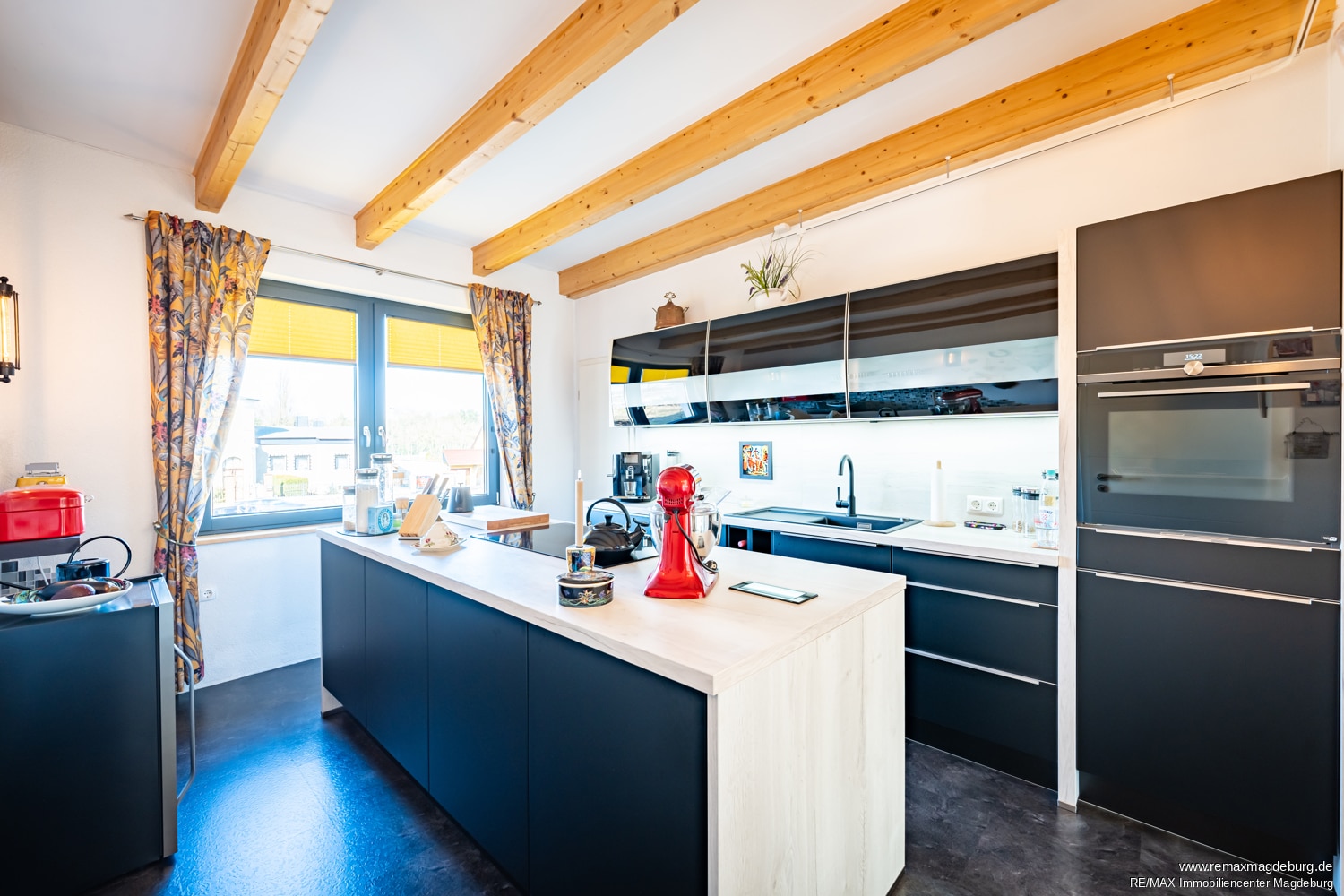 Die offene Küche, die nahtlos an den Wohnbereich anschließt, lässt keine Wünsche offen und erfüllt höchste Ansprüche. Sie ist mit einer hochwertigen Einbauküche und erstklassigen Geräten ausgestattet und verfügt über eine elegante Kochinsel, die sowohl funktional als auch ein stilvolles Highlight im Raum ist. Eine angrenzende Speisekammer bietet praktischen Stauraum, während ein separater Abstellraum mit Waschmaschinenanschluss zusätzlichen Komfort schafft.