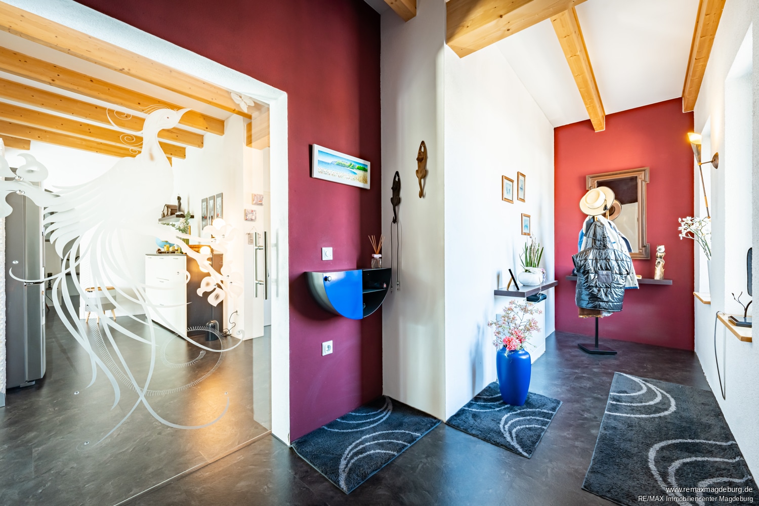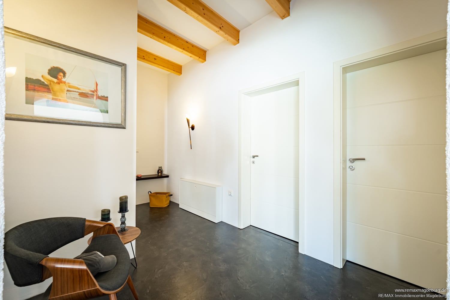 Der private Ruhebereich mit den Schlafräumen und Bädern ist durch einen eleganten Flur harmonisch vom offenen Wohnbereich getrennt. Eine markante, rund gestaltete Wand setzt dabei einen besonderen architektonischen Akzent und sorgt für eine sanfte, aber klare Abgrenzung. So genießen Sie in diesem Bereich jederzeit Ruhe und Privatsphäre.