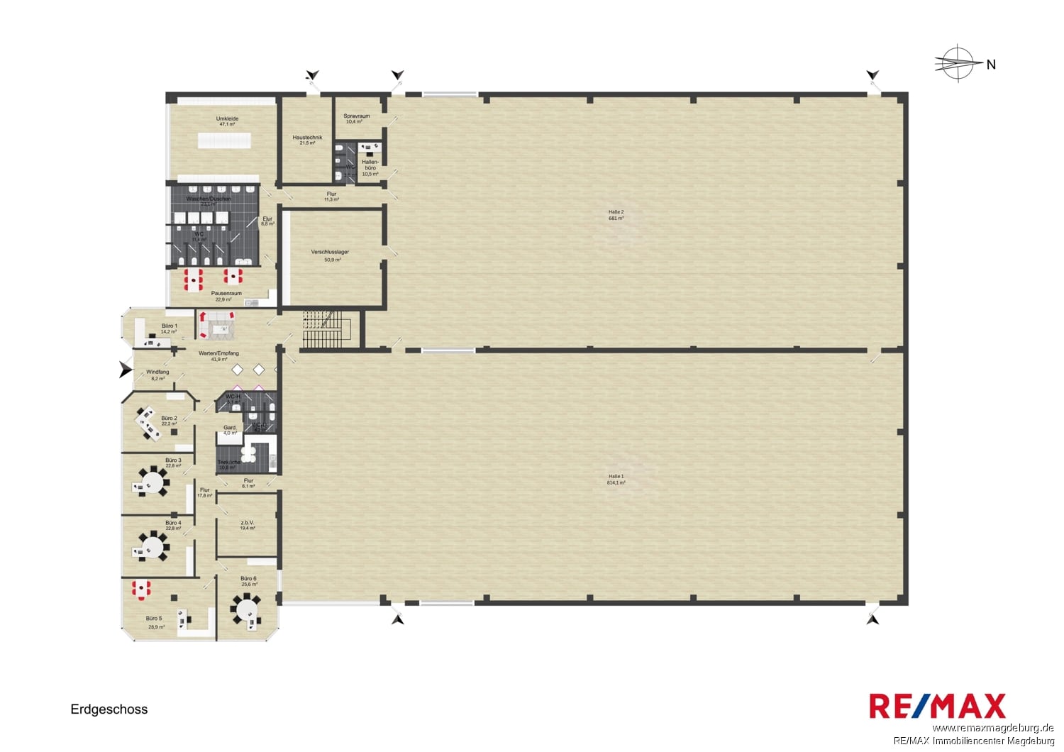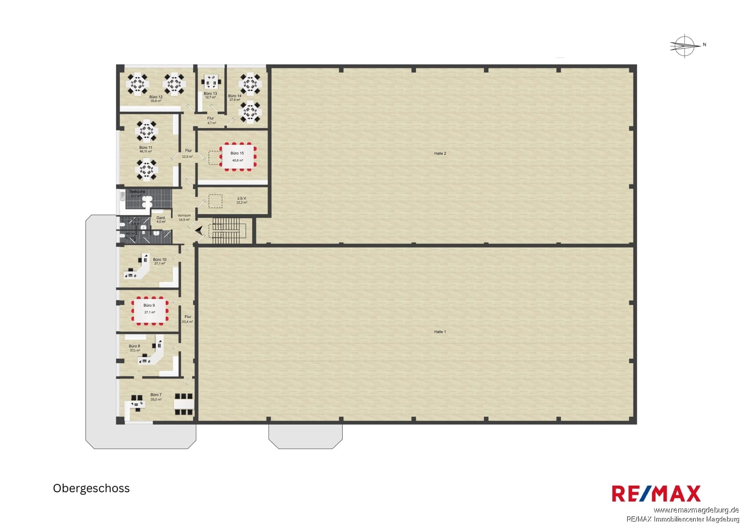 Das Obergeschoss bietet mit neun weiteren Büroräumen, zusätzlichen WC-Einheiten, Garderobe, Fluren und einer weiteren Tee-Küche ideale Bedingungen für Verwaltung, IT, Projektsteuerung oder Geschäftsführung – räumlich getrennt vom operativen Hallenbetrieb.