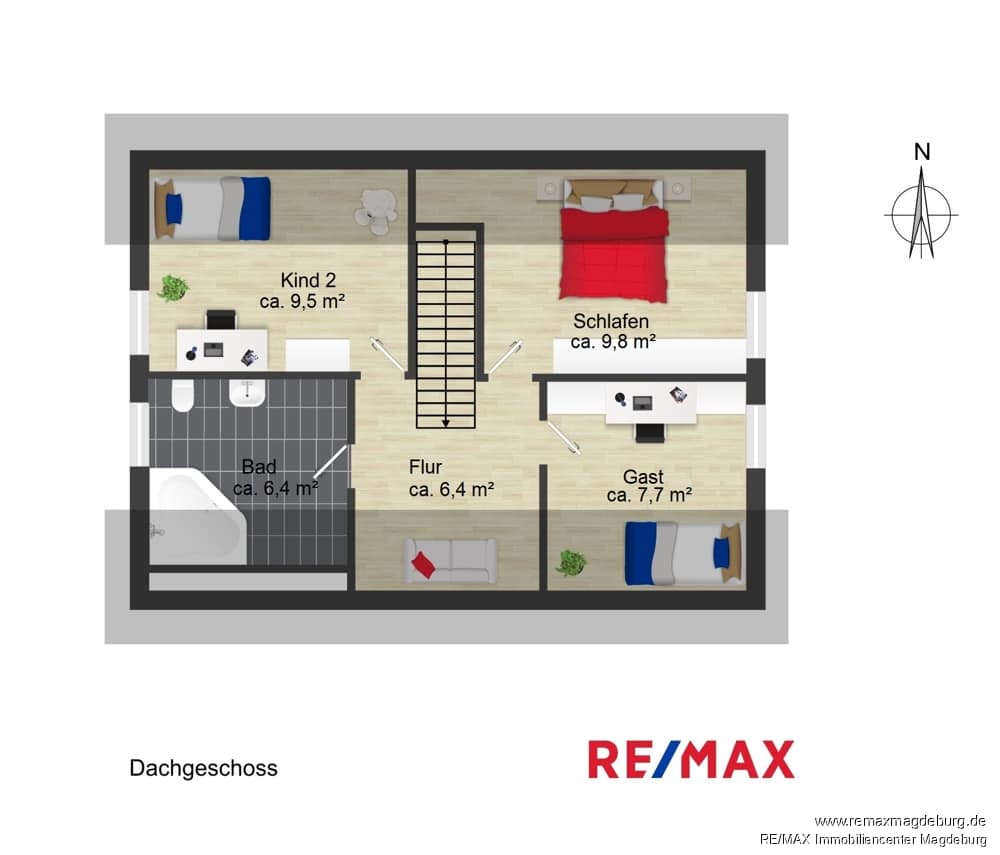 Insgesamt drei Zimmer, die nach Belieben individuell eingerichtet werden können und ein freundlich gestaltetes Tageslichtbad ausgestattet mit einer Badewanne stehen Ihnen im Dachgeschoss zur Verfügung.