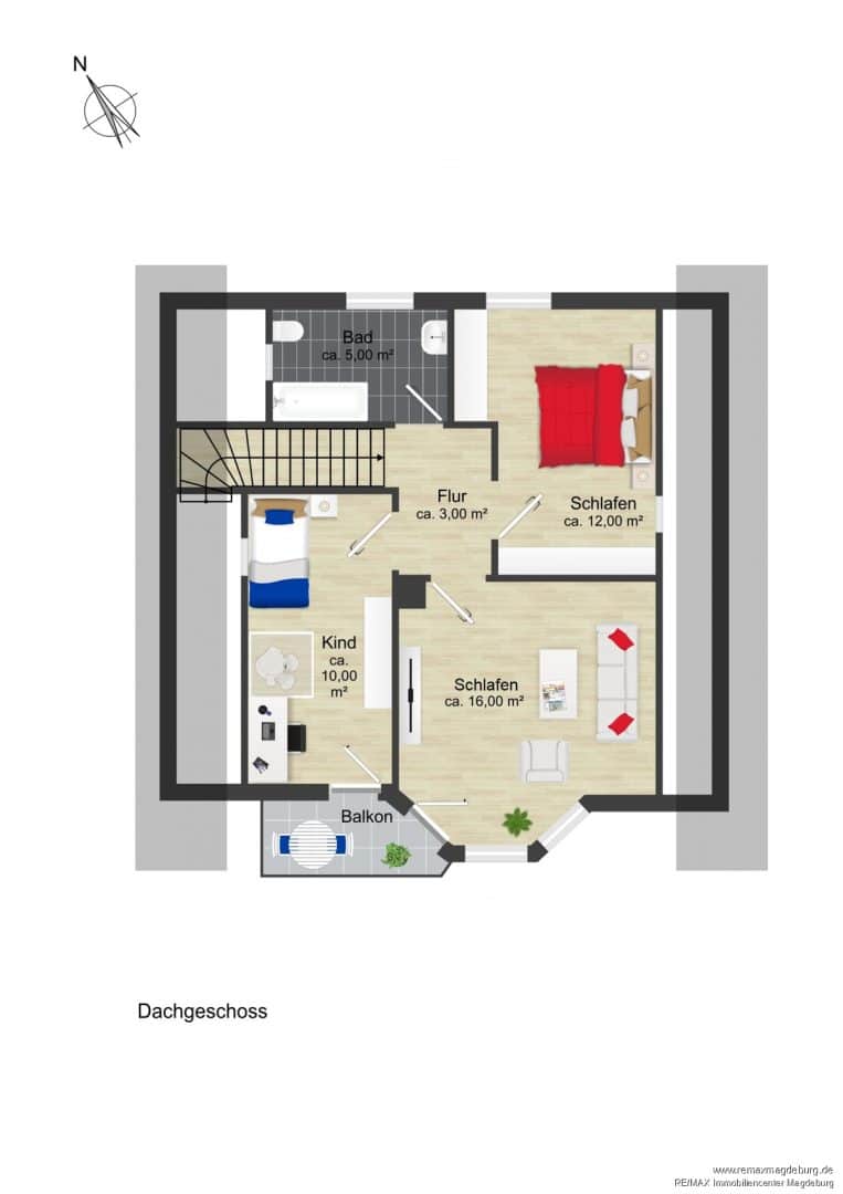 Des Weiteren befinden sich auf dieser Etage zwei Schlafzimmer mit Zugang zum südlich ausgerichteten Balkon, sowie ein weiteres Zimmer, welches je nach Bedarf als Schlaf-, Kinder-, Gäste- oder Arbeitszimmer eingerichtet werden kann.