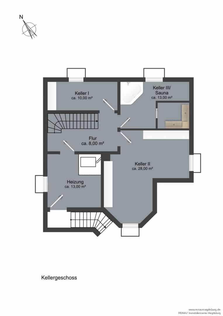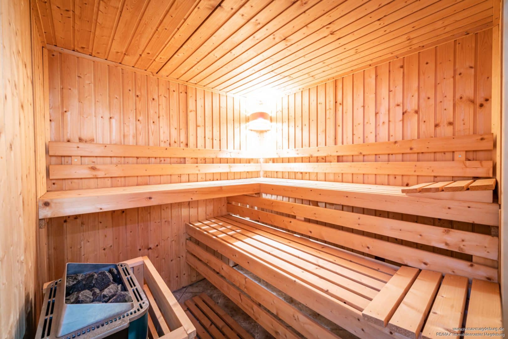 Selbstverständlich ist das Haus voll unterkellert, ausgebaut und beheizt. Er beherbergt neben mehreren Abstellräumen, einen kleinen Wellnessraum mit einer Sauna und einer Badewanne. Zudem bietet der Heizungsraum den Zugang in den Garten.