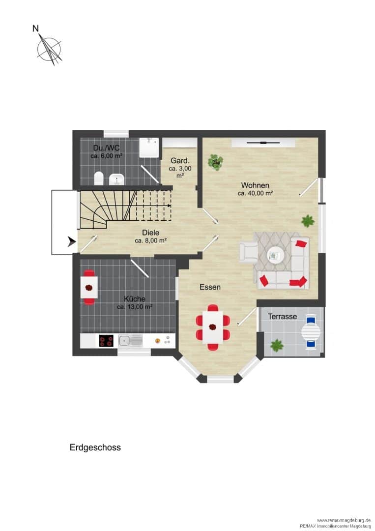 Hier wohnen Sie auf ca. 122 Quadratmetern eines freistehenden Einfamilienhauses umrahmt von einem gepflegten Garten auf einer Gesamtgrundstücksgröße von etwa 953 Quadratmetern.