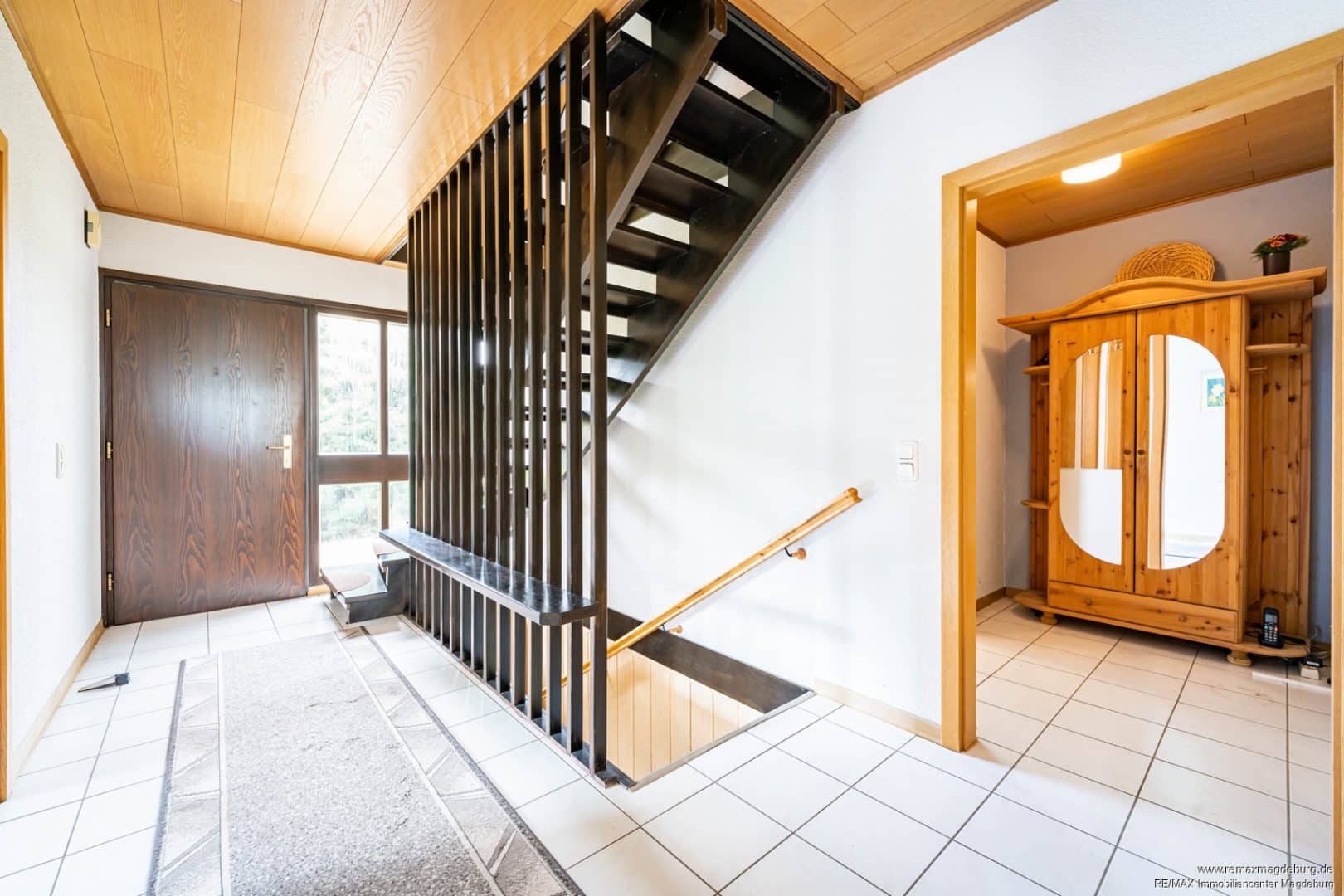 Eine leicht geschwungene Holztreppe ebnet den Weg in das Obergeschoss, wo sich ein weiteres Tageslicht Badezimmer, ausgestattet mit einer Badewanne befindet.