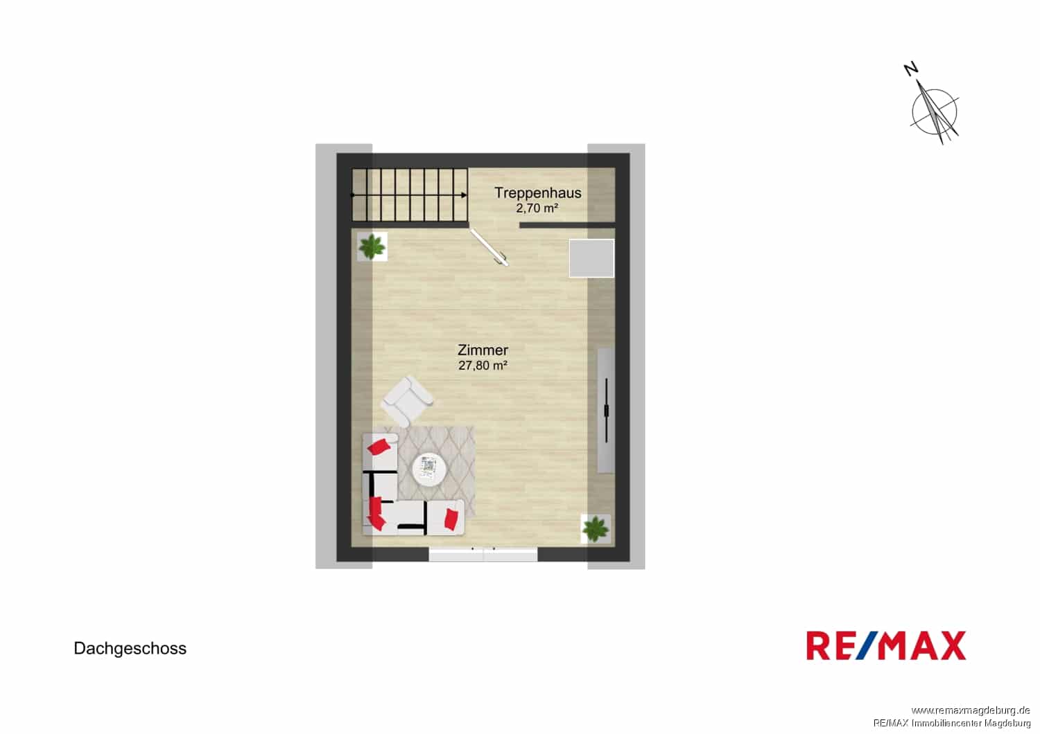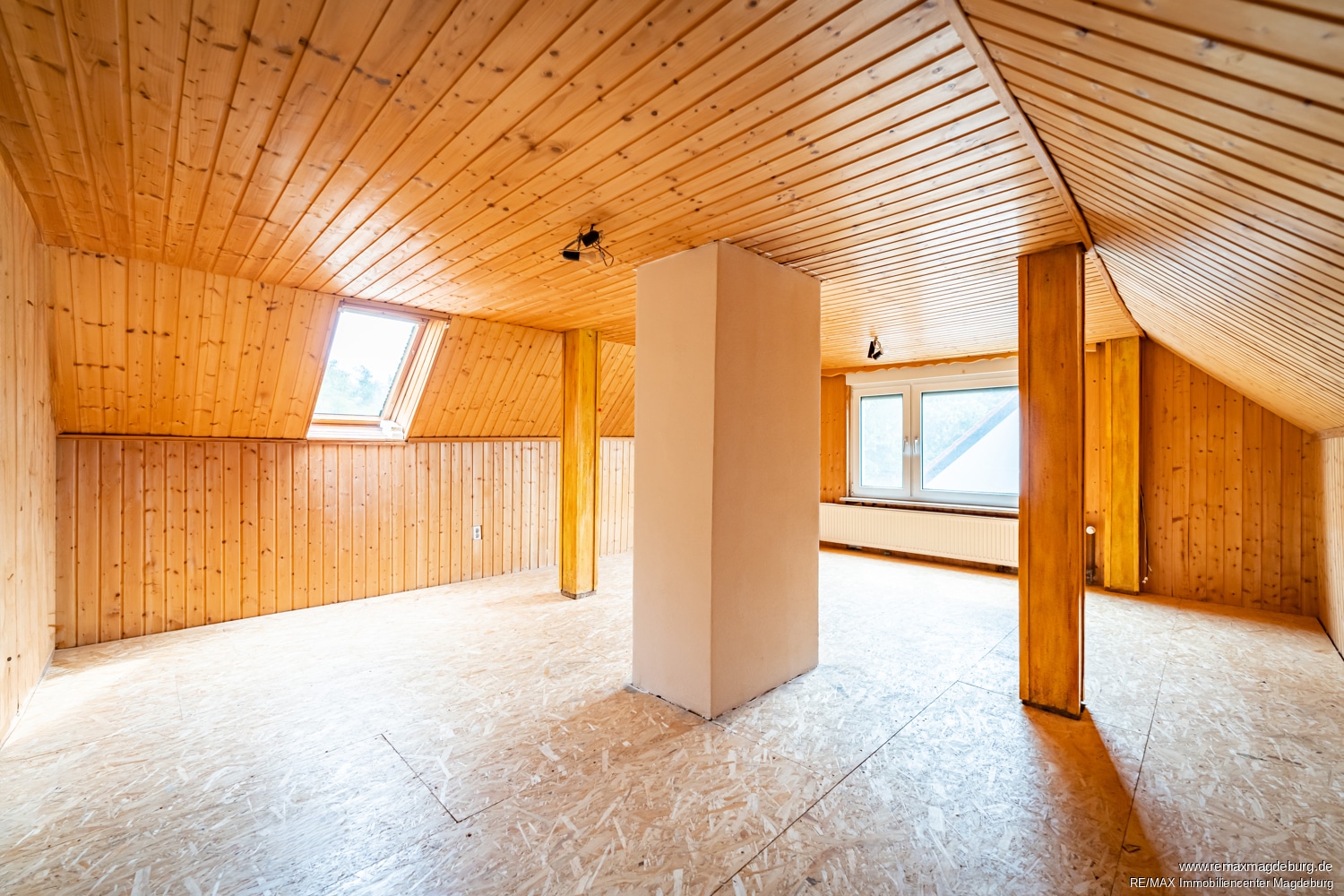 Im Dachgeschoss finden Sie einen kleinen Flur, der zu einem großzügigen Kinderzimmer führt. Dieses Zimmer eignet sich ideal als Spiel- oder Arbeitszimmer, auch wenn die Deckenhöhe hier unter 2 Metern liegt.