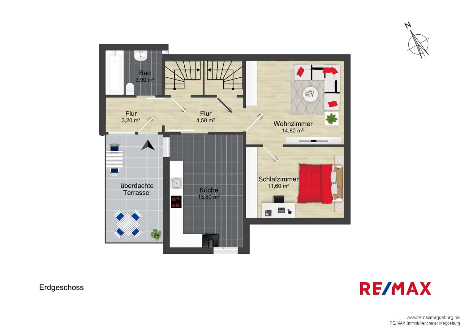 Im Erdgeschoss erwarten Sie helle und freundliche Räume: ein Wohnzimmer für gemeinsame Familienabende, eine Küche als Mittelpunkt des Zusammenlebens, ein Schlafzimmer sowie ein Tageslichtbad mit Badewanne.