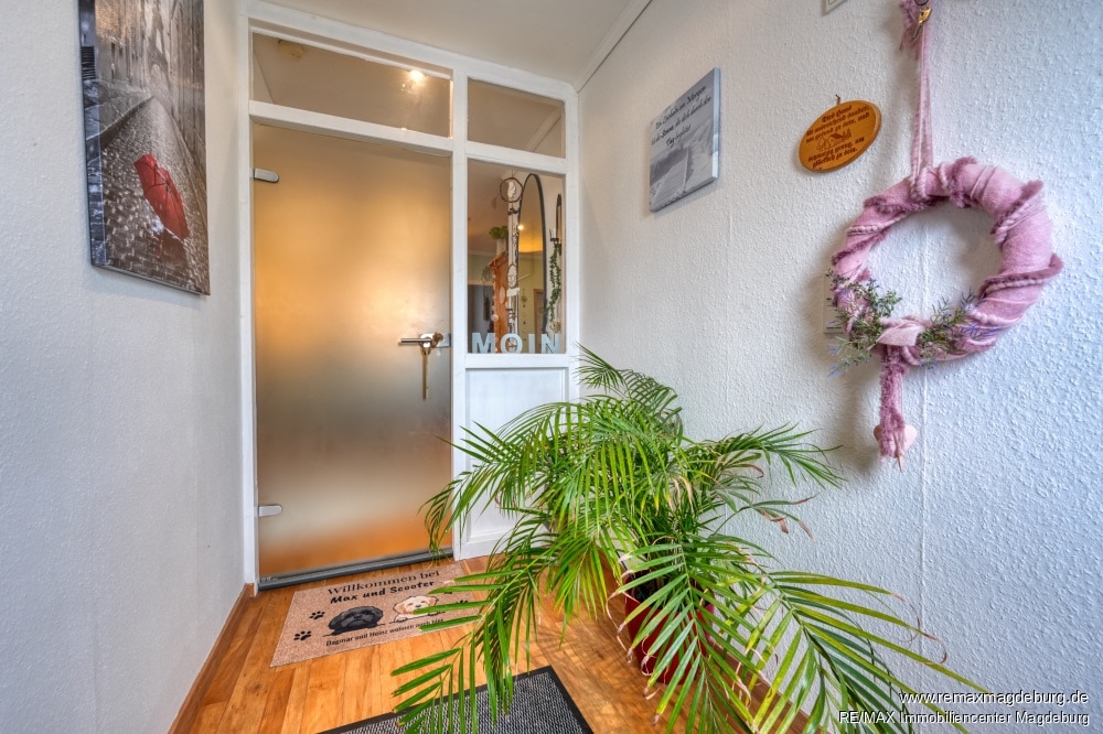 Flur, Wohn- und Esszimmer mit Balkon, Schlafzimmer, 3. Zimmer, Badezimmer mit Wanne und eine geräumige Küche.