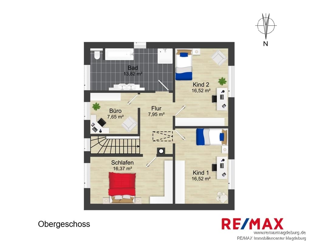 Das Obergeschoss bietet eine klare und familienfreundliche Aufteilung. Über den Flur erschließen sich ein weiteres Büro, ein großzügiges Badezimmer mit Badewanne und Dusche sowie ein Kinderzimmer und ein komfortables Schlafzimmer. Ein zusätzliches Zimmer kann je nach Bedarf als Arbeits-, Kinder- oder Gästezimmer genutzt werden und unterstreicht die Flexibilität dieser Immobilie.