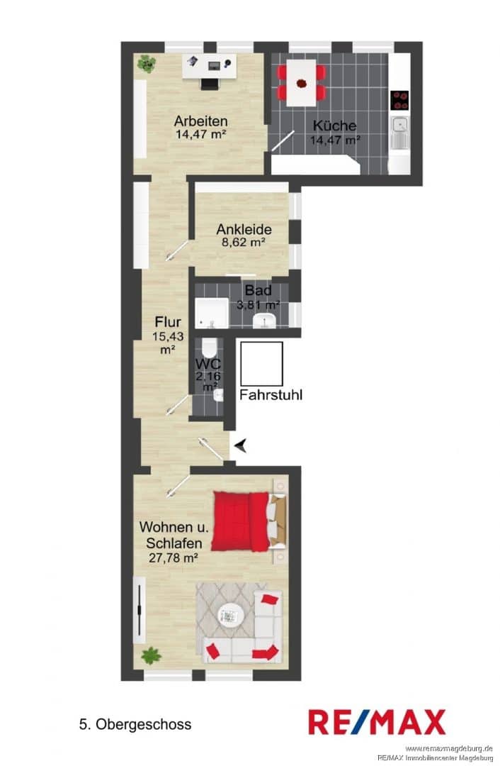 Die 3-R-Wohnung im 5.Obergeschoss ist wie folgt aufgeteilt: