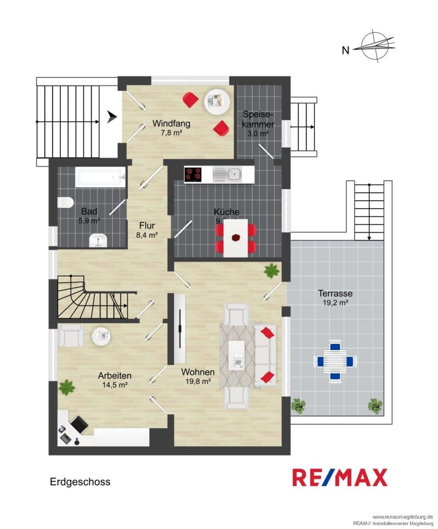 Im Erdgeschoss erwartet Sie eine praktische und funktionale Raumaufteilung mit dem Wohnbereich und direkten Zugang zur Terrasse, die ideal für entspannte Stunden im Freien ist.