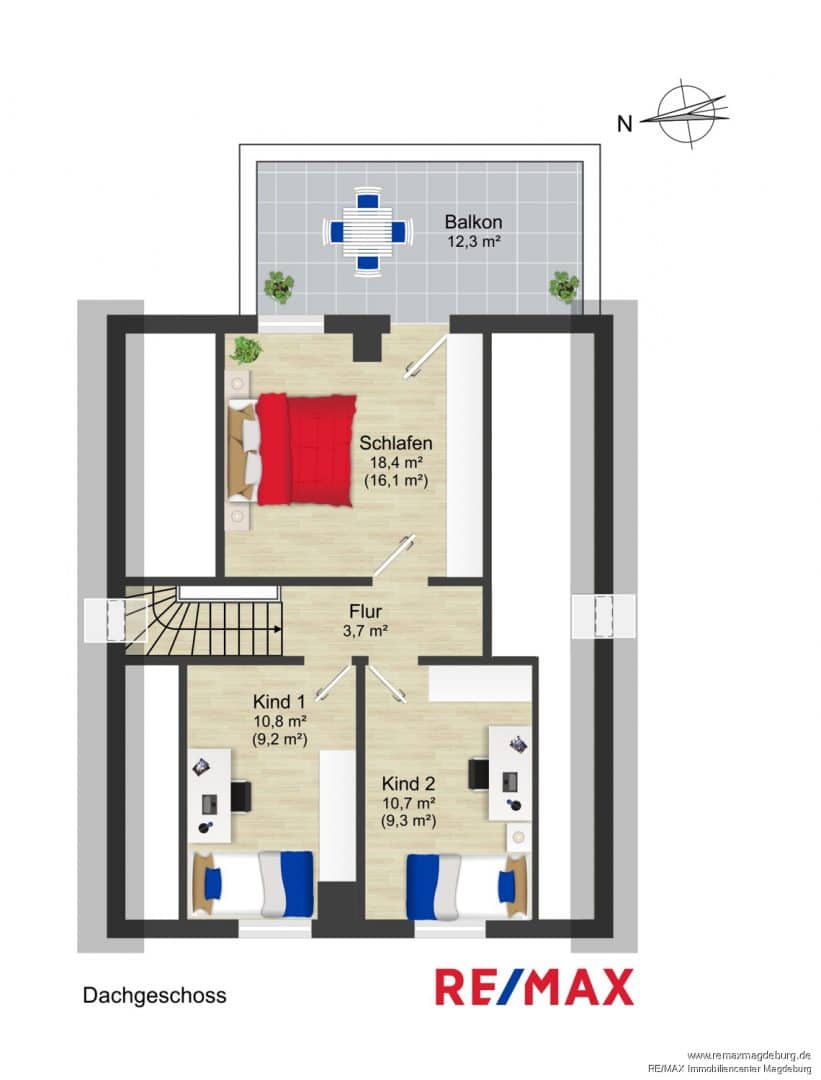 Im Dachgeschoss befinden sich drei gut geschnittene Schlafzimmer, eines davon mit einem eigenen Balkon, der einen schönen Ausblick und zusätzlichen Platz im Freien bietet.