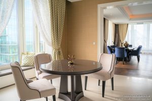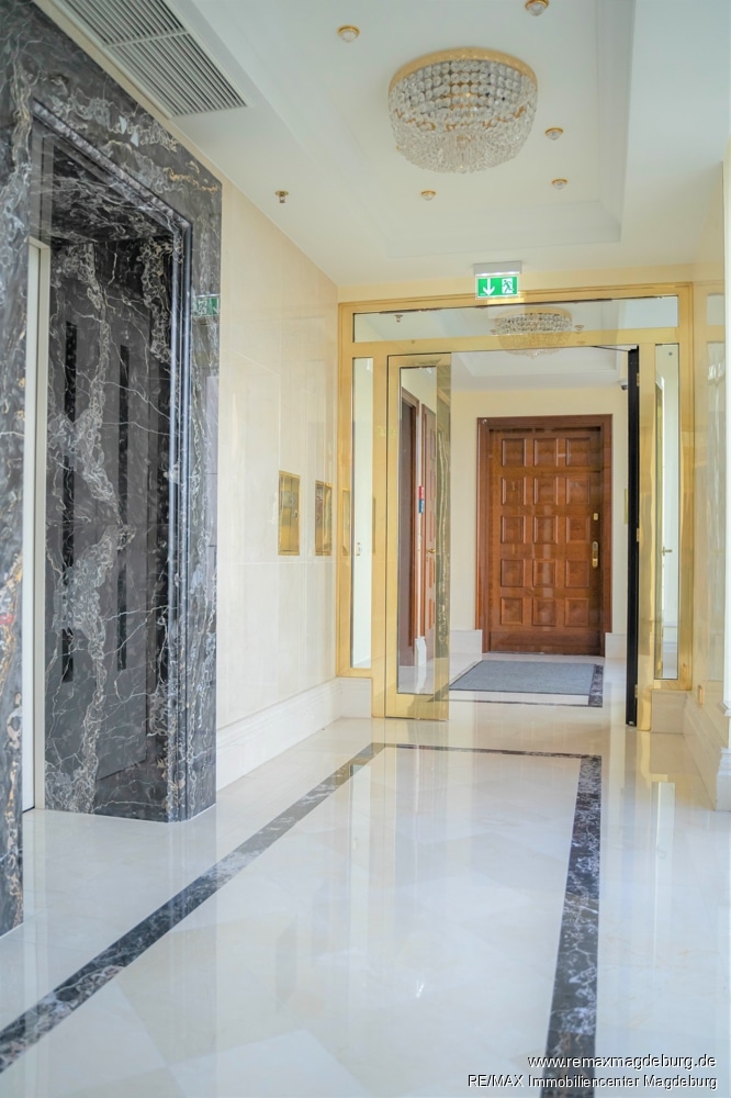Das Appartement befindet sich in der 16. Etage des Gebäudekomplexes, geprägt von exquisiter Architektur und detaillierter Ausarbeitung. Durch den privaten und hochwertig gestalteten Eingang gelangen Sie über einen Aufzug zu Ihrem Appartement. Das Herzstück der Suite bildet der 83m² große Wohn- und Essbereich mit einem grandiosen Blick über die City. Ausgestattet mit erstklassigem Merbau Parkett, großen Fenstern, Flügeltüren und indirekter Deckenbeleuchtung, strahlt dieser Raum absolute Glamourösität und Wärme aus. Des Weiteren finden Sie dort eine Gaderobe sowie ein Gäste-WC vor.