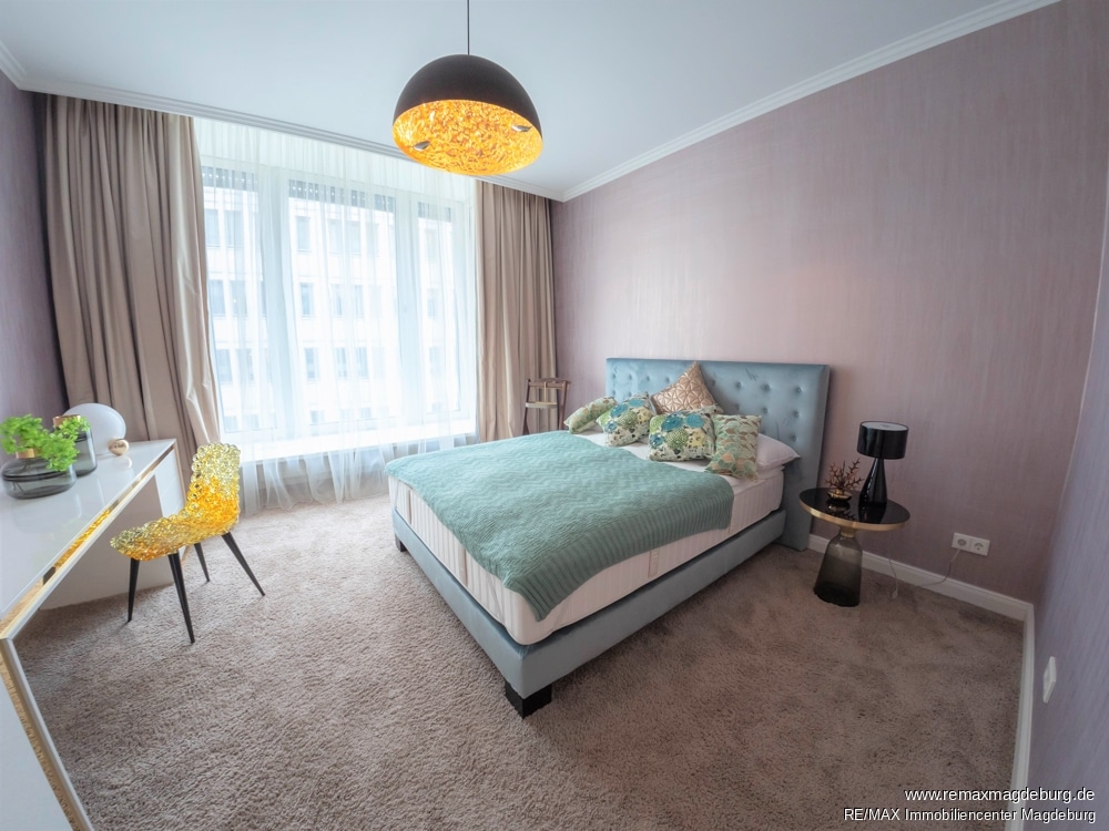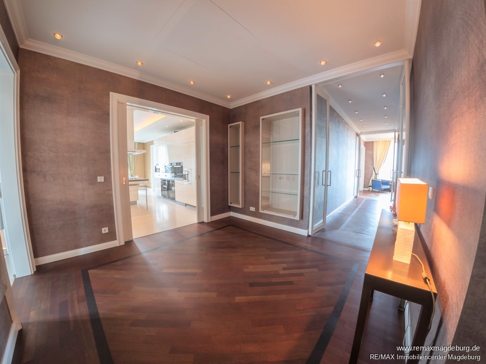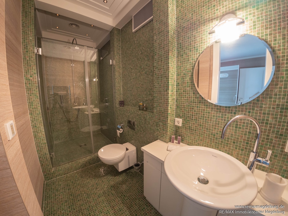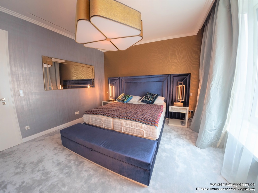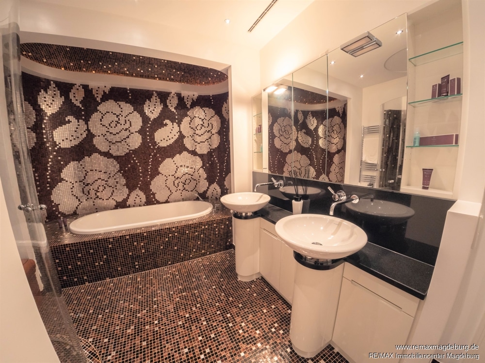 Der durchdachte Grundriss wird vor allem durch die Separierung des Privaten Bereiches deutlich. Neben dem Master-Bedroom befindet sich ein eigenes Ankleidezimmer sowie das Master-Bad, welches mit Bisazza und Weißgold verziert wurde. Ein Highlight ist vor allem die Whirlpool-Badewanne.
