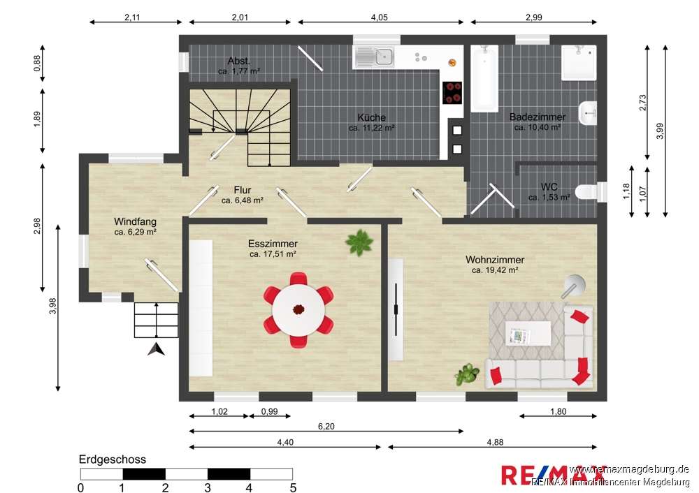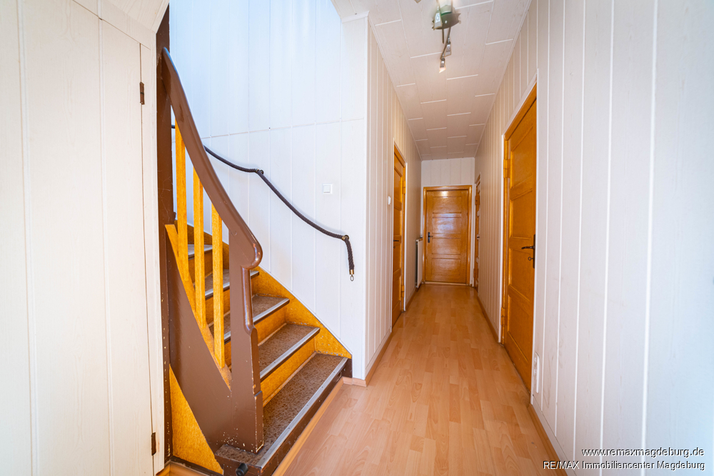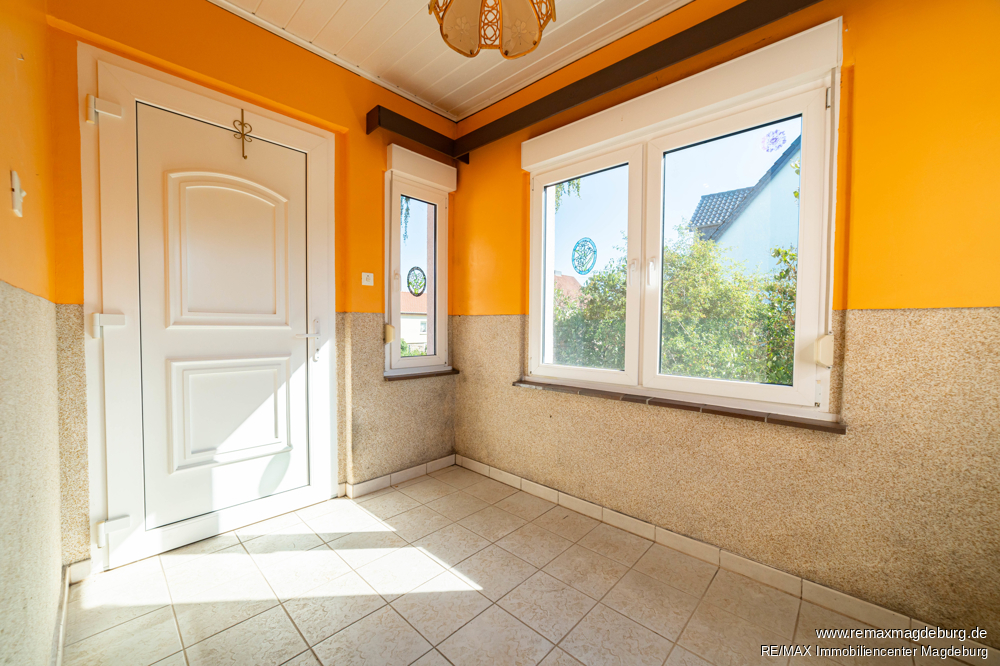 Empfangen werden Sie durch einen geräumigen Windfang. Vom anschließenden Flur aus gehen alle Räume des Erdgeschosses - das Wohnzimmerzimmer, Esszimmer, Badezimmer mit abgetrennten WC-Bereich und die Küche mit Abstellraum - ab.
