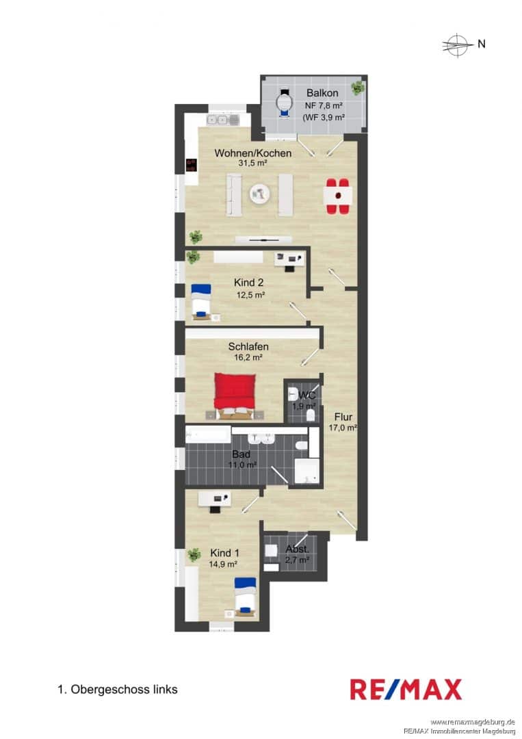 Die 4-Raumwohung im 1. Obergeschoss links ist wie folgt aufgeteilt:
