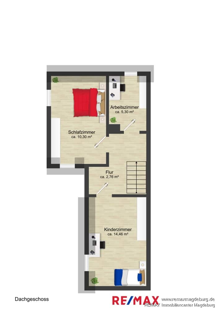 Im Dachgeschoss gelangen Sie in einen Flur, von dem aus sich ein geräumiges Schlafzimmer, ein Kinderzimmer und ein Gäste- oder Arbeitszimmer befinden. Diese Räume bieten eine ruhige Rückzugsmöglichkeit und viel Platz für individuelle Gestaltung.