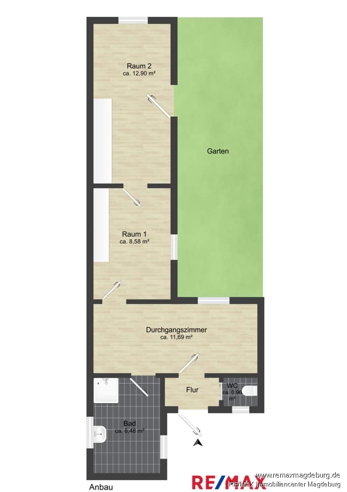 Zusätzlich erreichen Sie von der Küche aus die kleine Terrasse, die in den gepflegten Garten und den Anbau führt. Der Anbau kann vielseitig genutzt werden, beispielsweise als Einliegerwohnung. Er verfügt zudem über einen separaten Eingang, wodurch Sie noch mehr Raum für Ihre Ideen und Projekte schaffen können.