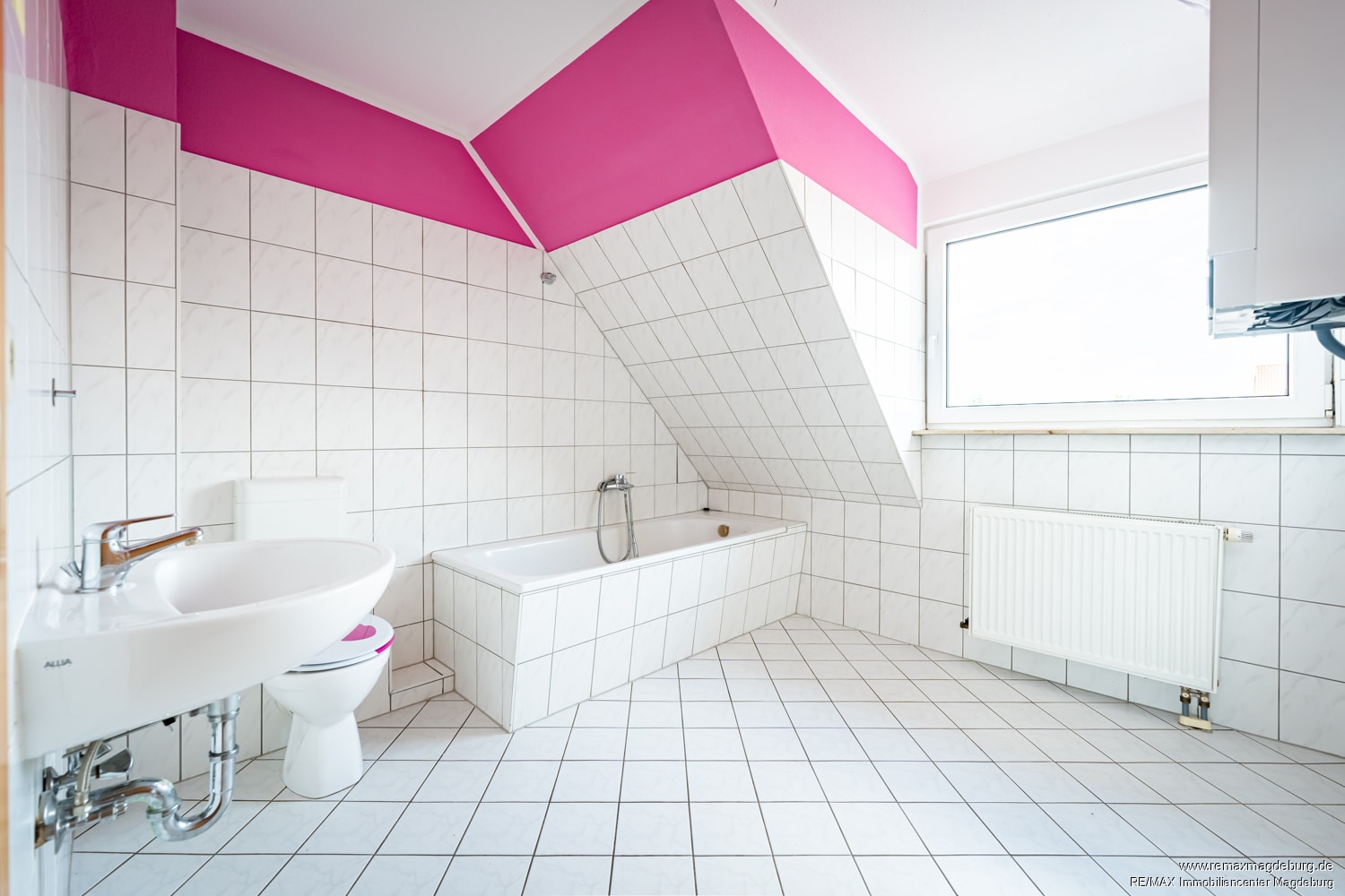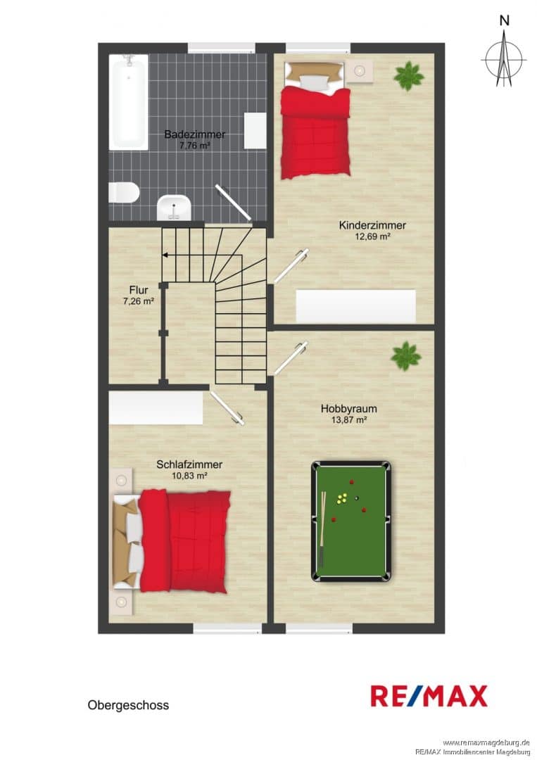 Über die Treppe gelangen Sie in das Obergeschoss, wo sich drei weitere Zimmer befinden. Diese eignen sich hervorragend als Schlafzimmer, Kinderzimmer oder Arbeitszimmer. Das Tageslichtbad ist mit einer Badewanne ausgestattet und bietet durch das große Fenster eine angenehme Wohlfühlatmosphäre.