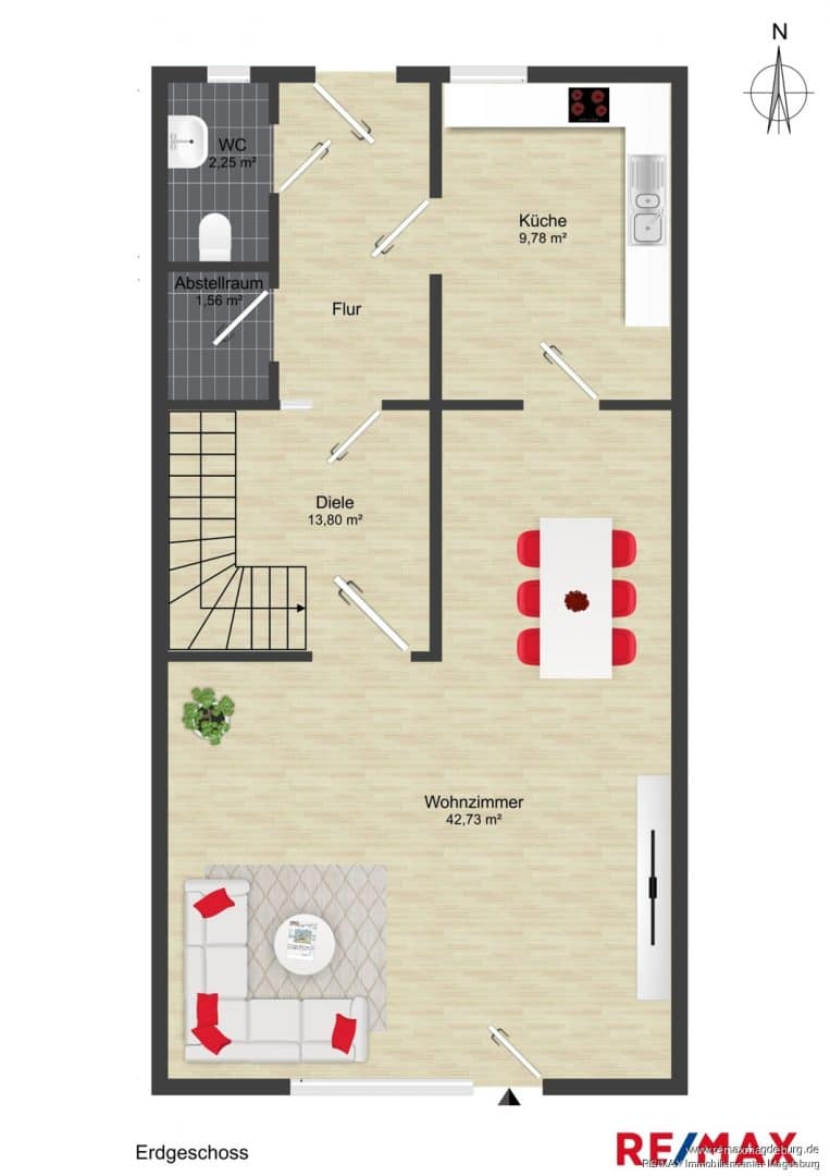 Beim Betreten des Hauses empfängt Sie ein heller Hausflur, der zu den verschiedenen Bereichen des Erdgeschosses führt. Das großzügige, lichtdurchflutete Wohnzimmer bietet direkten Zugang zur Terrasse – ideal für entspannte Stunden im Freien. Die angrenzende Küche ist funktional gestaltet und bietet ausreichend Platz für individuelle Einrichtungsideen. Ein praktisches Gäste-WC mit Tageslicht befindet sich ebenfalls im Erdgeschoss, sowie ein Abstellraum für zusätzlichen Stauraum.