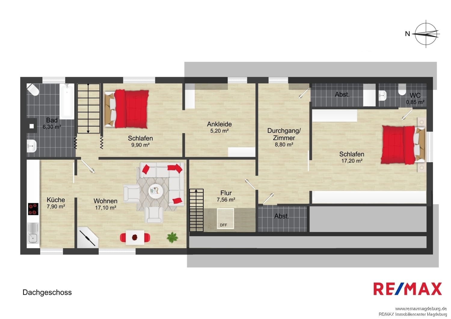 Im Dachgeschoss befinden sich ein Flur, ein Durchgangszimmer, ein Schlafzimmer sowie ein separates WC – ein Rückzugsort mit vielfältigen Gestaltungsmöglichkeiten.
