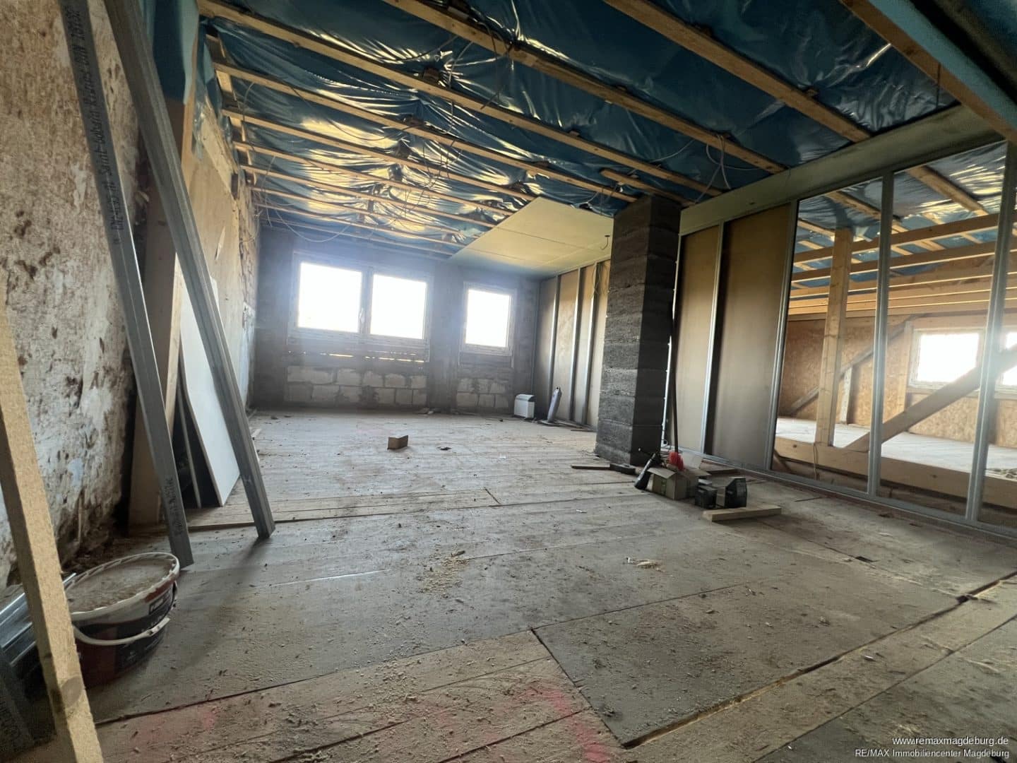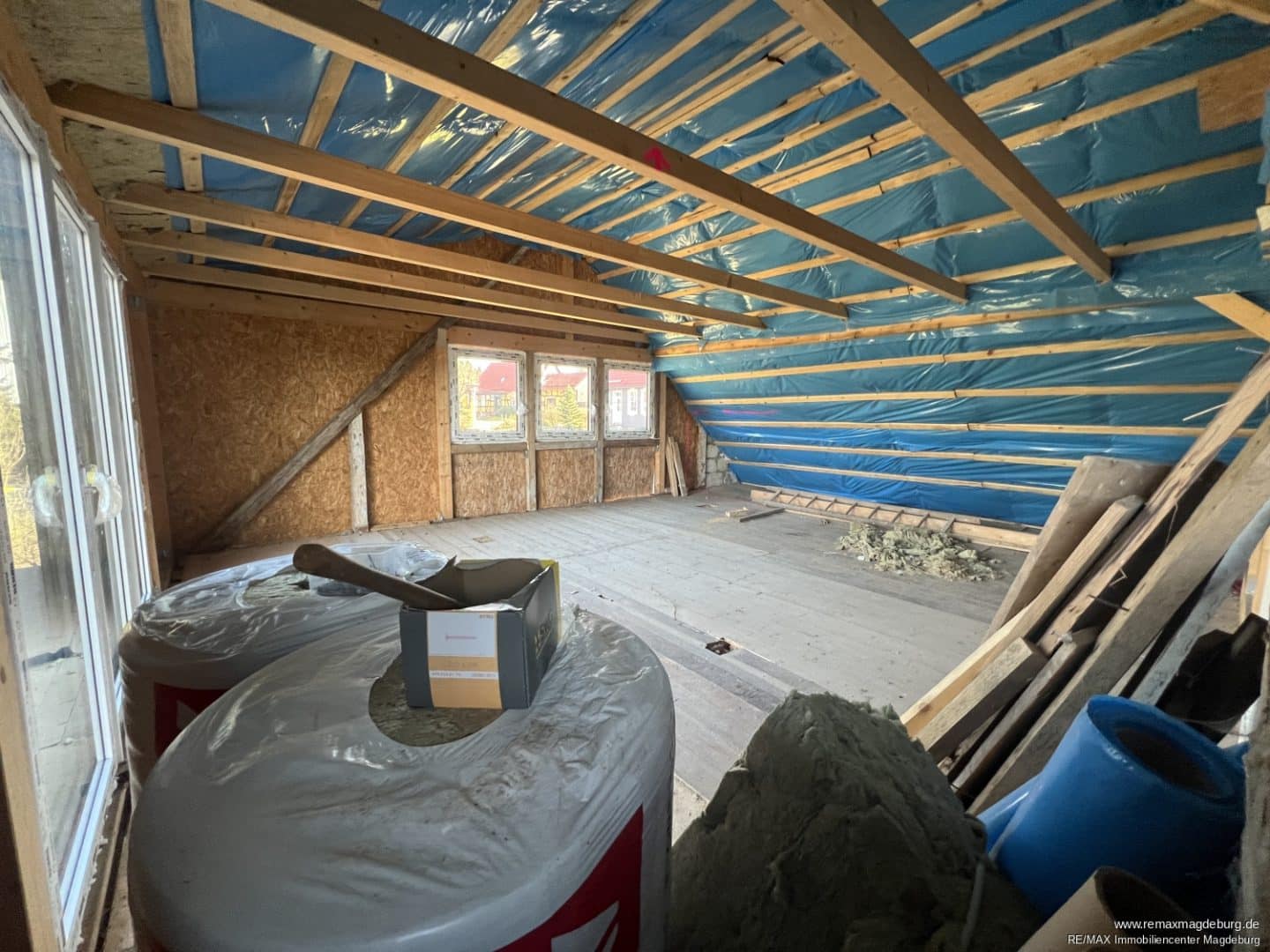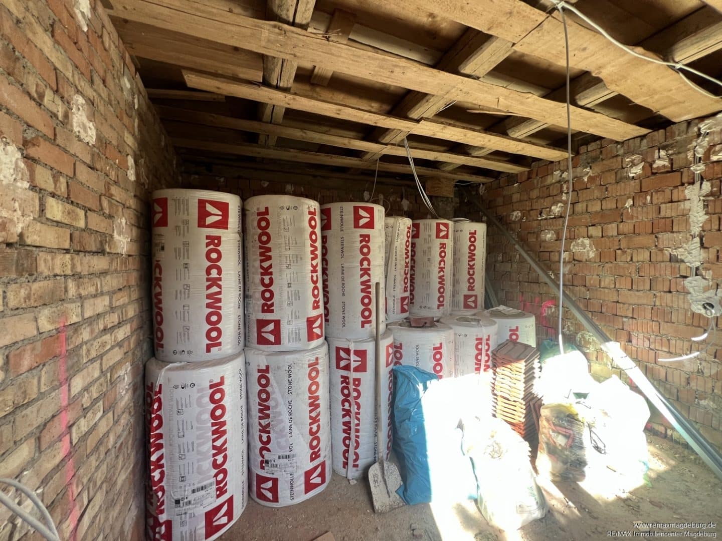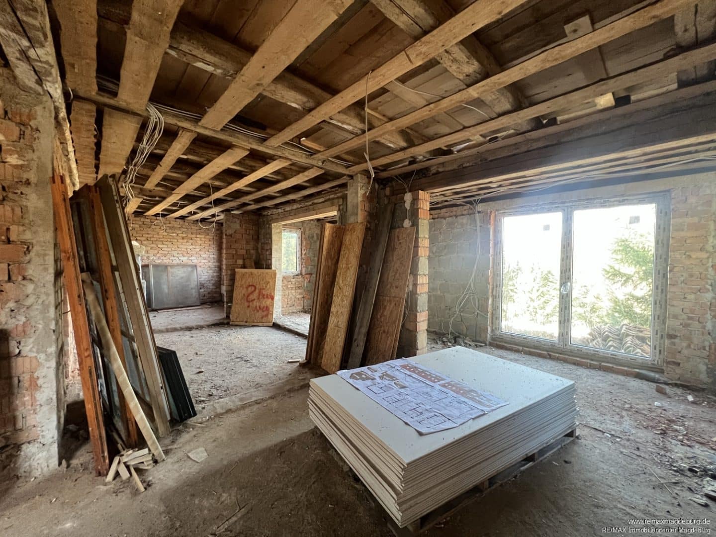 Bereits wichtige Baumaterialien wurden für Sie bereitgestellt, um den Umbau zügig und effizient voranzutreiben. So sind Trockenbau, Dämmmaterial, neue Fenster und moderne Terrassentüren bereits eingebaut. Darüber hinaus liegt das Material für eine stilvolle Harzer Holzvertäfelung für die Außenfassade bereit, was dem Haus eine besondere, natürliche Optik verleiht.