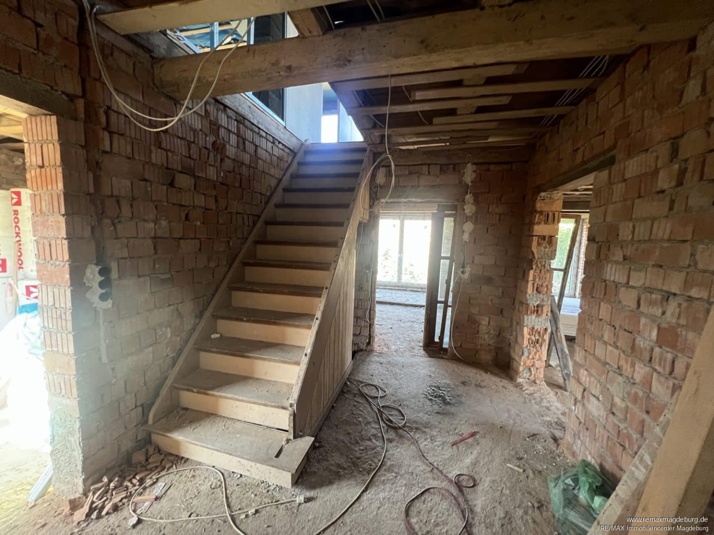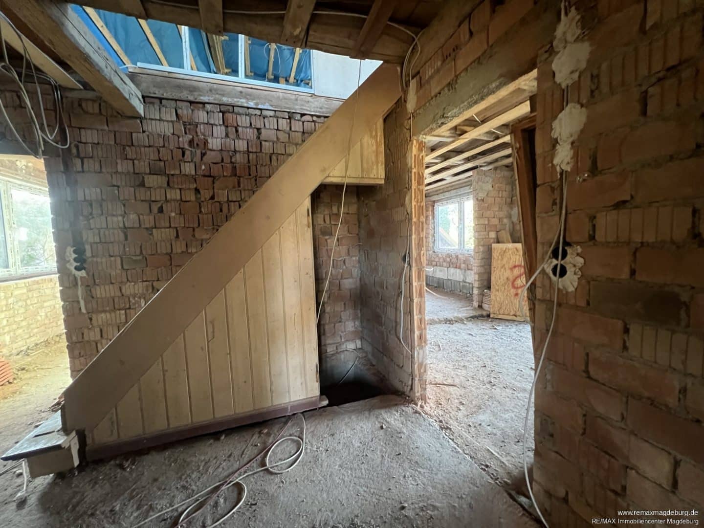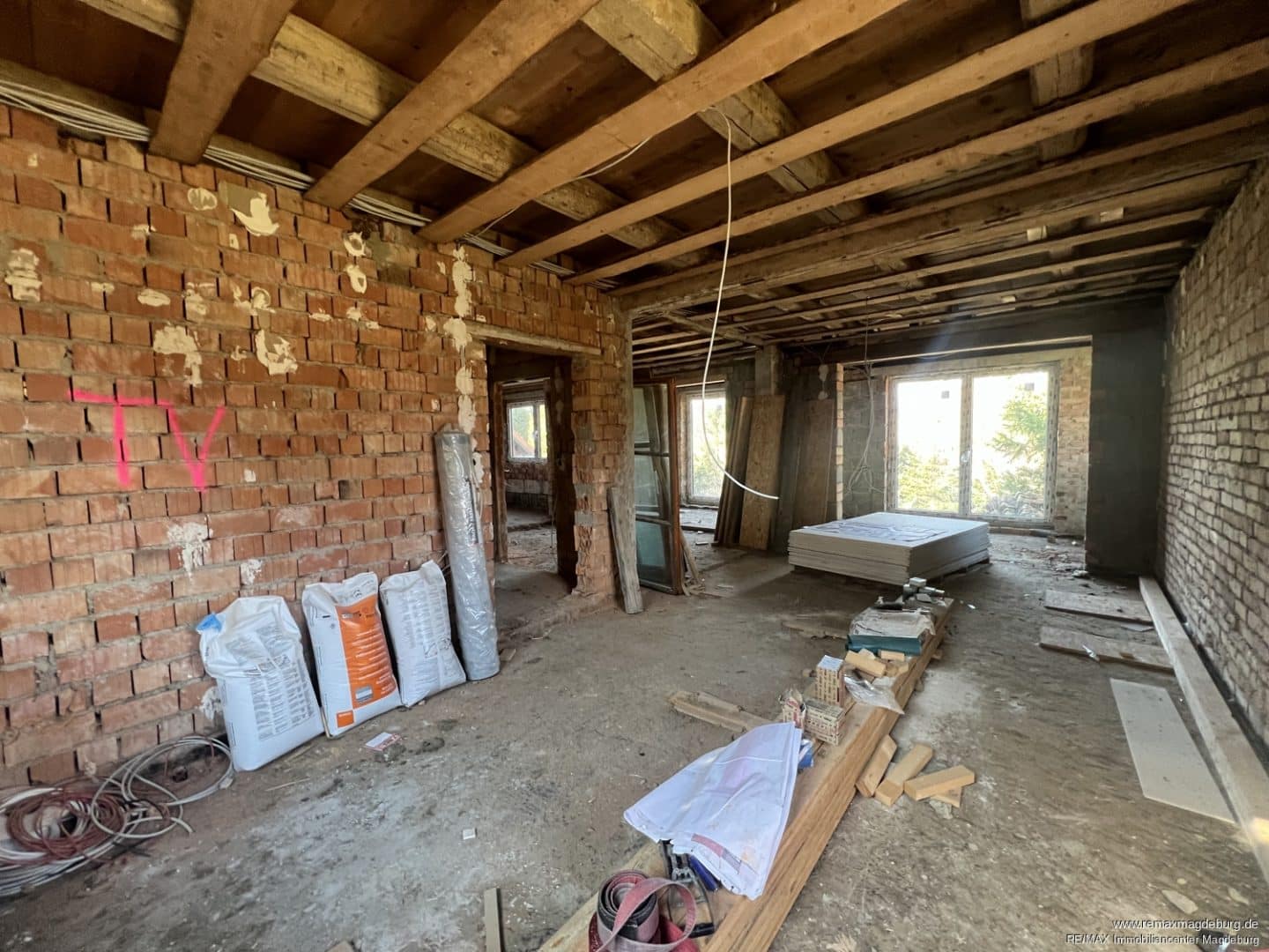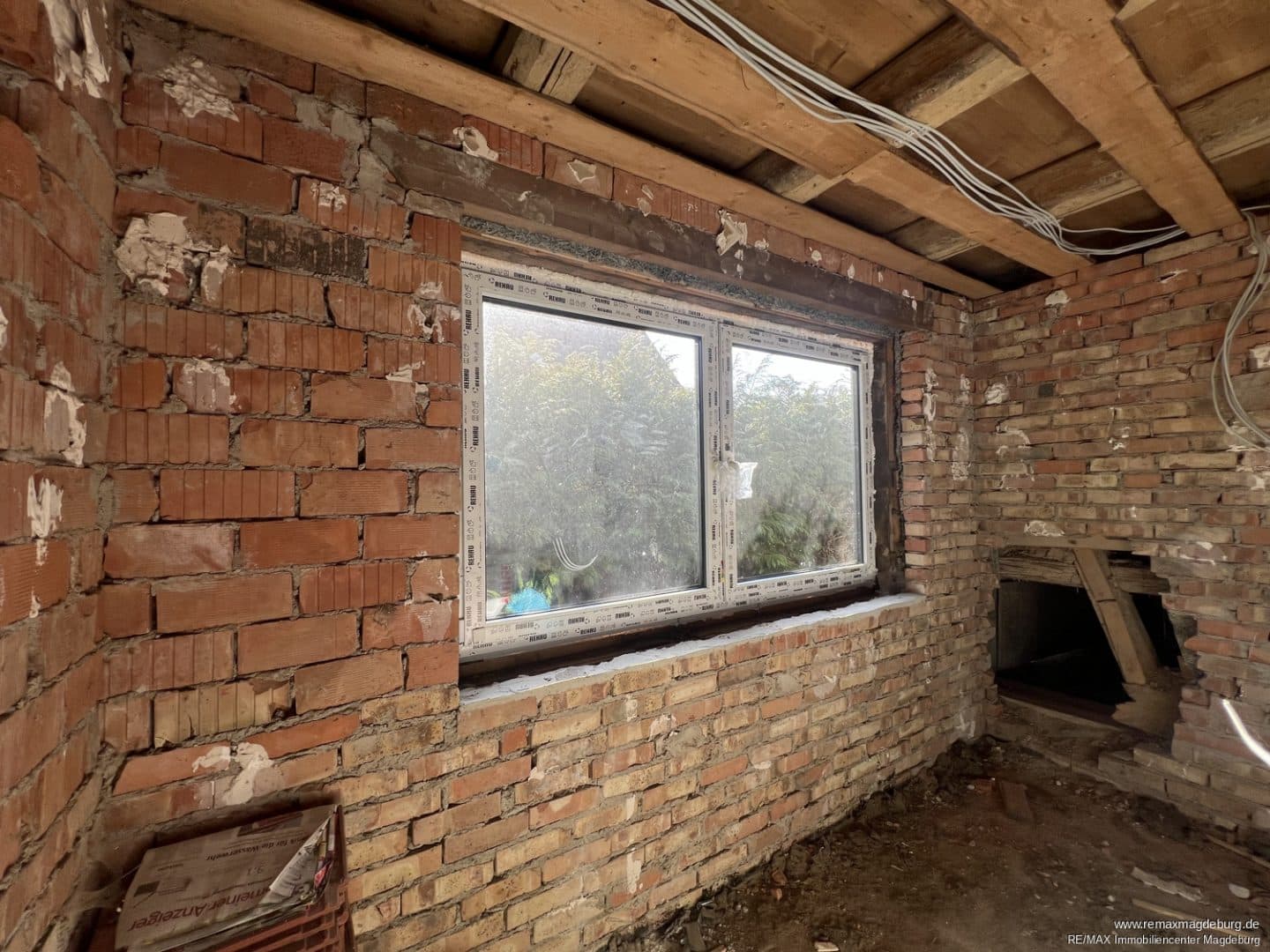 Bereits wichtige Baumaterialien wurden für Sie bereitgestellt, um den Umbau zügig und effizient voranzutreiben. So sind Trockenbau, Dämmmaterial, neue Fenster und moderne Terrassentüren bereits eingebaut. Darüber hinaus liegt das Material für eine stilvolle Harzer Holzvertäfelung für die Außenfassade bereit, was dem Haus eine besondere, natürliche Optik verleiht.