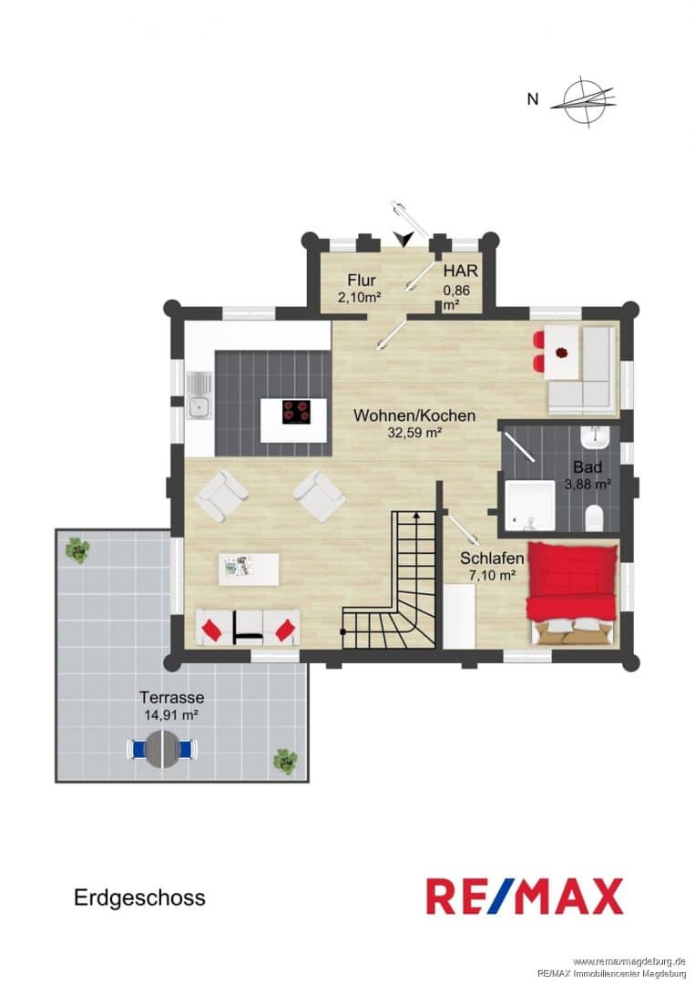 Das Ferienhaus bietet 4 Zimmer, eine Küche und zwei Bäder auf zwei Etagen. Im Erdgeschoss befindet sich das Wohn- und Esszimmer mit Zugang zur überdachten Terrasse, eine geräumige Küche und ein Duschbad.