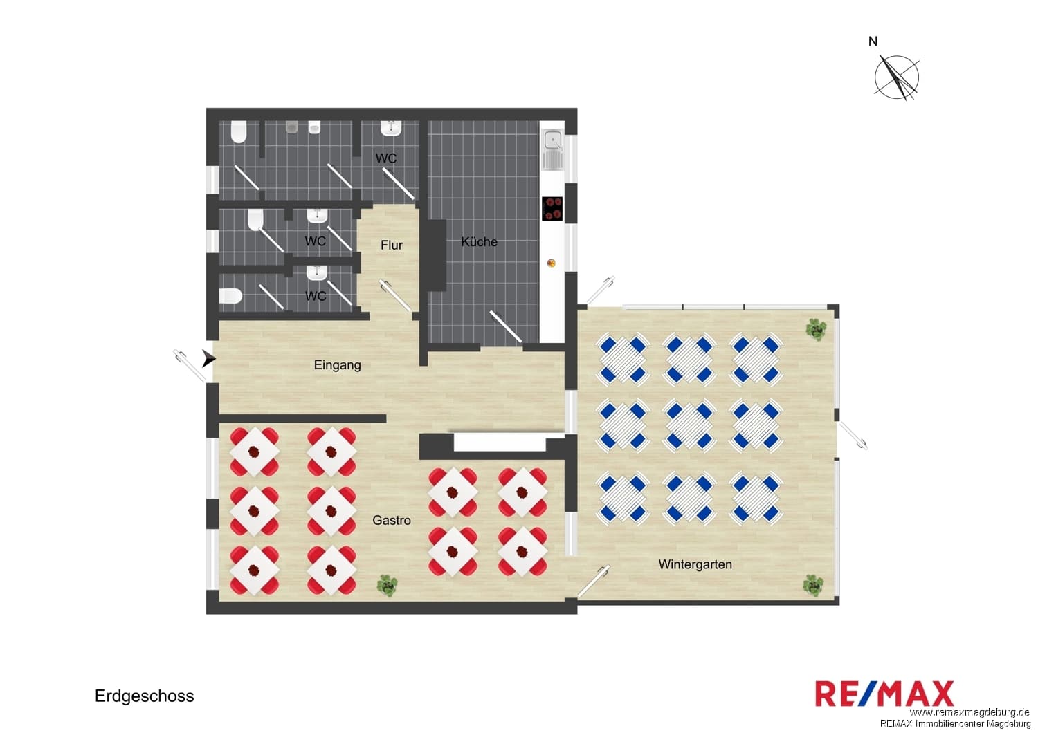 Diese vielseitige Gewerbeeinheit überzeugt durch eine durchdachte Raumaufteilung, attraktive Nutzungsmöglichkeiten und eine solide bauliche Basis. Im Erdgeschoss stehen Ihnen zwei großzügige Gewerberäume zur Verfügung, die sich flexibel für unterschiedliche Geschäftskonzepte eignen. Ergänzt wird diese Ebene durch einen separaten Personalraum sowie jeweils ein Damen- und Herren-WC – ideale Voraussetzungen für einen professionellen Geschäftsbetrieb.