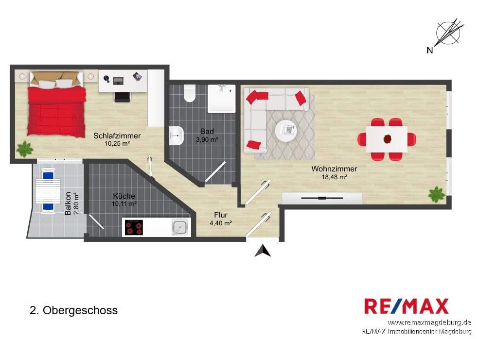 Der lichtdurchflutete Wohnbereich schafft eine einladende Atmosphäre, während der Balkon zum Entspannen im Freien einlädt und zugleich den Wohnraum optisch erweitert. Das Schlafzimmer bietet ausreichend Platz und einen angenehmen Rückzugsort. Die Küche ist mit einer Einbauküche ausgestattet und bietet mit dem direkten Zugang zum Balkon ideale Voraussetzungen für gemütliche Kochabende mit Blick ins Freie.