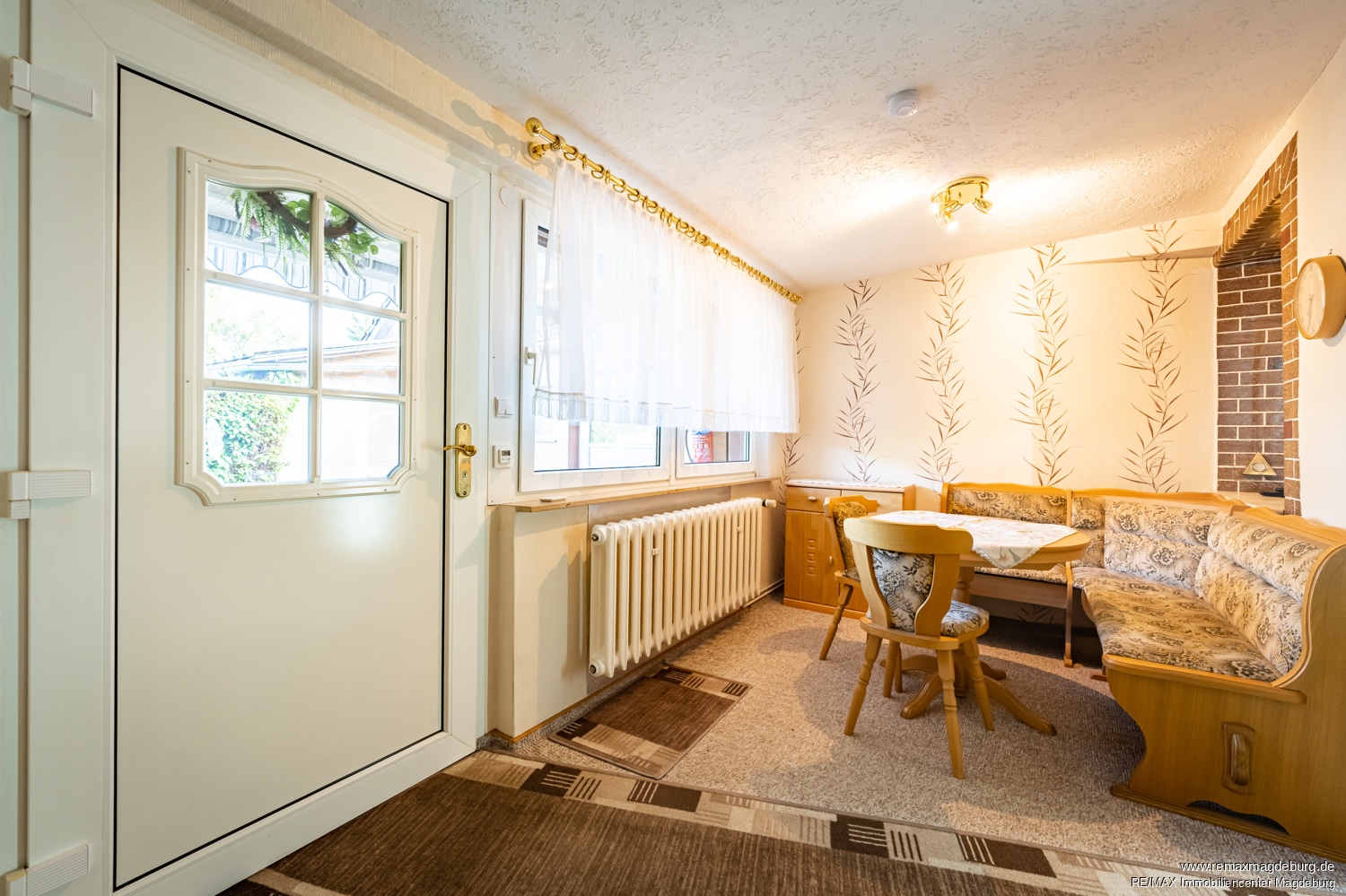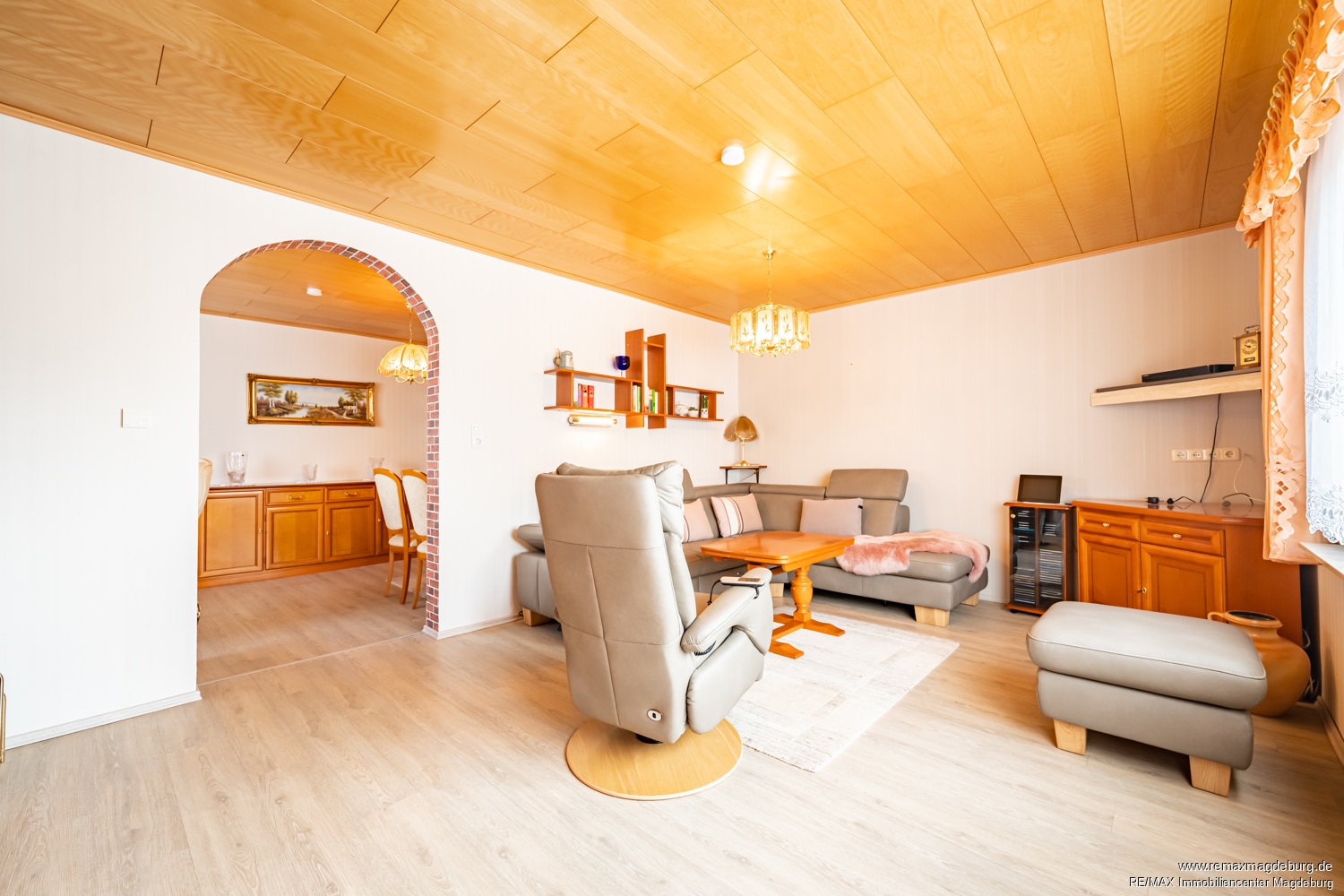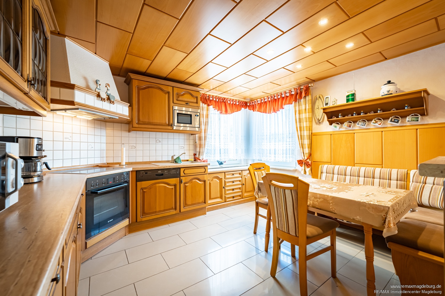 Die funktional gestaltete Küche mit Einbauküche bietet ausreichend Platz für die tägliche Zubereitung von Speisen. Vom Flur aus erreichen Sie das gemütliche Esszimmer, das als Durchgangszimmer zum großzügigen und hellen Wohnbereich dient. Hier entsteht eine harmonische Verbindung zwischen Essen und Wohnen – ideal für gemeinsame Mahlzeiten, geselliges Beisammensein und erholsame Stunden.