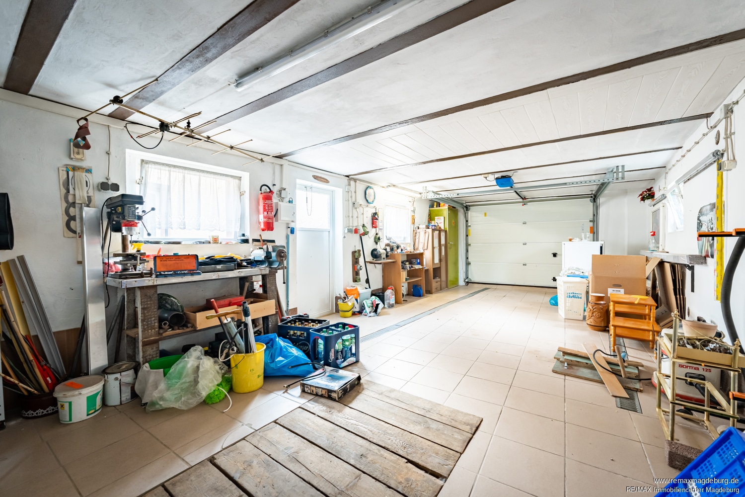 Straßenseitig befindet sich eine Garage mit elektrischem Rolltor, die zusätzlich über eine kleine Werkstatt verfügt. Dahinter schließt sich eine praktische Waschküche an. Ein separates Nebengelass erweitert das Angebot und beherbergt eine weitere Garage, einen Lagerraum sowie einen Hühnerstall mit angrenzendem Außengehege.