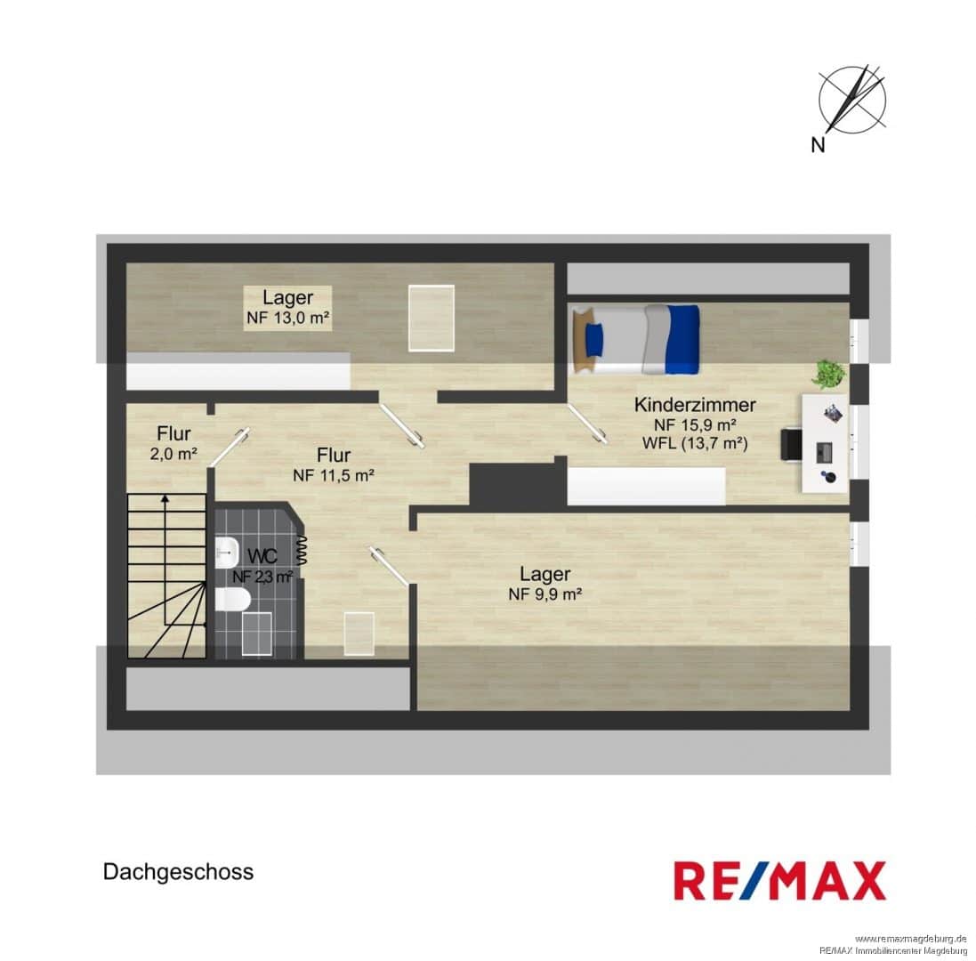 Im Dachgeschoss erwartet Sie ein Flur, von dem aus alle Räume erreichbar sind. Neben einem separaten WC befindet sich hier ein Kinderzimmer, das sich vielseitig nutzen lässt und Raum für Spiel, Lernen oder kreative Entfaltung bietet.