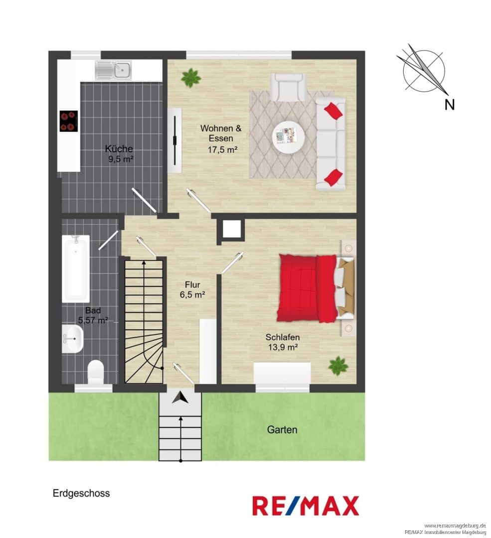 Im Erdgeschoss befinden sich ein Wohnzimmer, ein Schlafzimmer, eine separate Küche sowie ein Tageslichtbad. Alle Räume sind über den zentral gelegenen Flur erreichbar.
