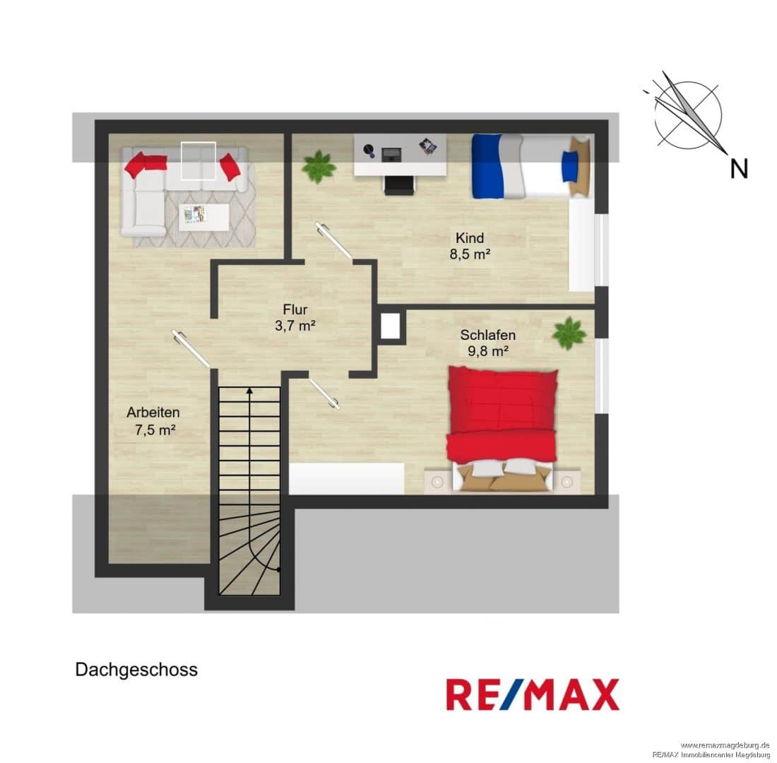 Das Dachgeschoss bietet drei weitere Zimmer, die flexibel als Kinderzimmer, Homeoffice oder Gästezimmer genutzt werden können.