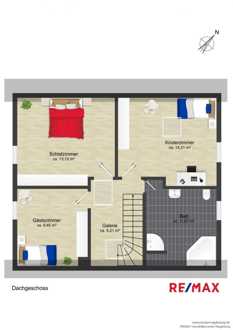 Im Obergeschoss finden Sie ein Tageslichtbad mit Dusche und Eckbadewanne sowie zwei Kinderzimmer und ein großzügiges Elternschlafzimmer, die viel Platz zum Träumen bieten. Die Galerie eignet sich durch das lichtspendende Dachfenster perfekt für eine Lese- oder Büro Ecke.