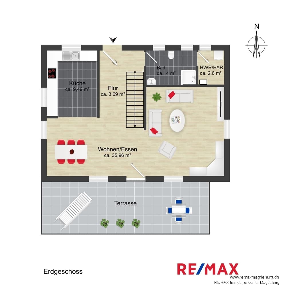 Im Erdgeschoss empfängt Sie ein heller Flur, von dem aus alle Räume bequem erreichbar sind. Das großzügige Wohn- und Esszimmer mit direktem Zugang zur Terrasse bildet das Herzstück des Hauses und lädt zu geselligen Stunden mit Familie und Freunden ein. Die offene Küche mit moderner Einbauküche fügt sich harmonisch in den Wohnbereich ein und schafft eine angenehme Verbindung zwischen Kochen und Wohnen. Ergänzt wird das Raumangebot auf dieser Etage durch ein modernes Tageslichtbad mit Dusche sowie einen praktischen Hauswirtschaftsraum.