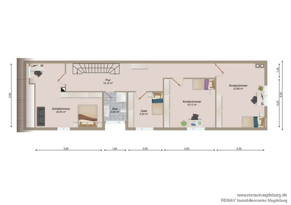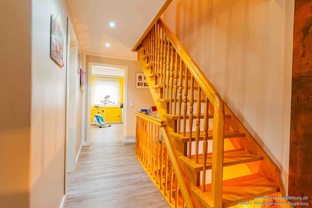Über eine Holztreppe gelangen Sie in die obere Etage des Hauses. Hier befinden sich drei Kinderzimmer, ein Arbeitszimmer sowie ein Tageslichtbad mit Dusche. Über eine Wendeltreppe können Sie auch in den Garten gelangen.