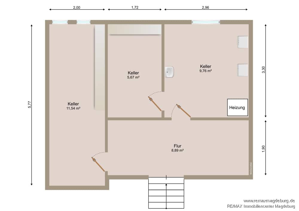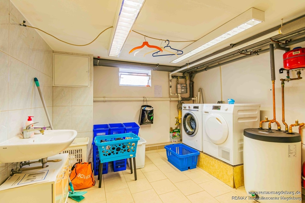 Zugang vom Erdgeschoss in den Keller gibt es über eine Holztreppe. Der Keller bietet zwei Abstellräume und ein Waschmaschinenraum mit Waschbecken sowie Heizungsanlage.