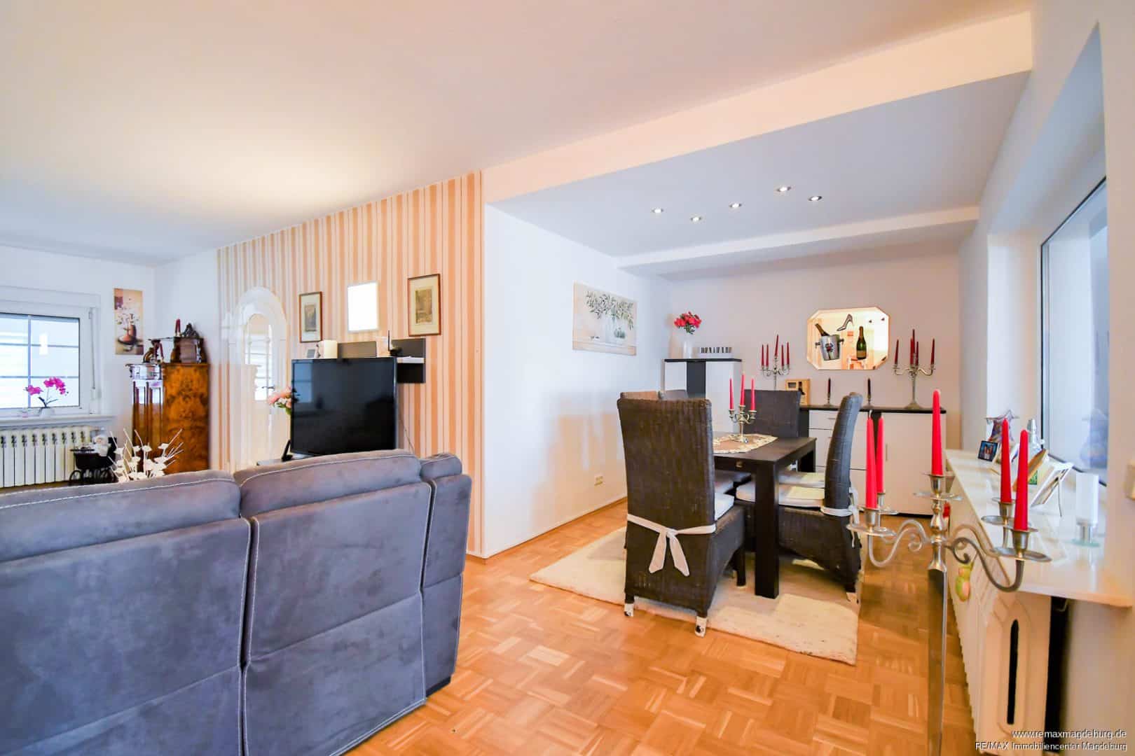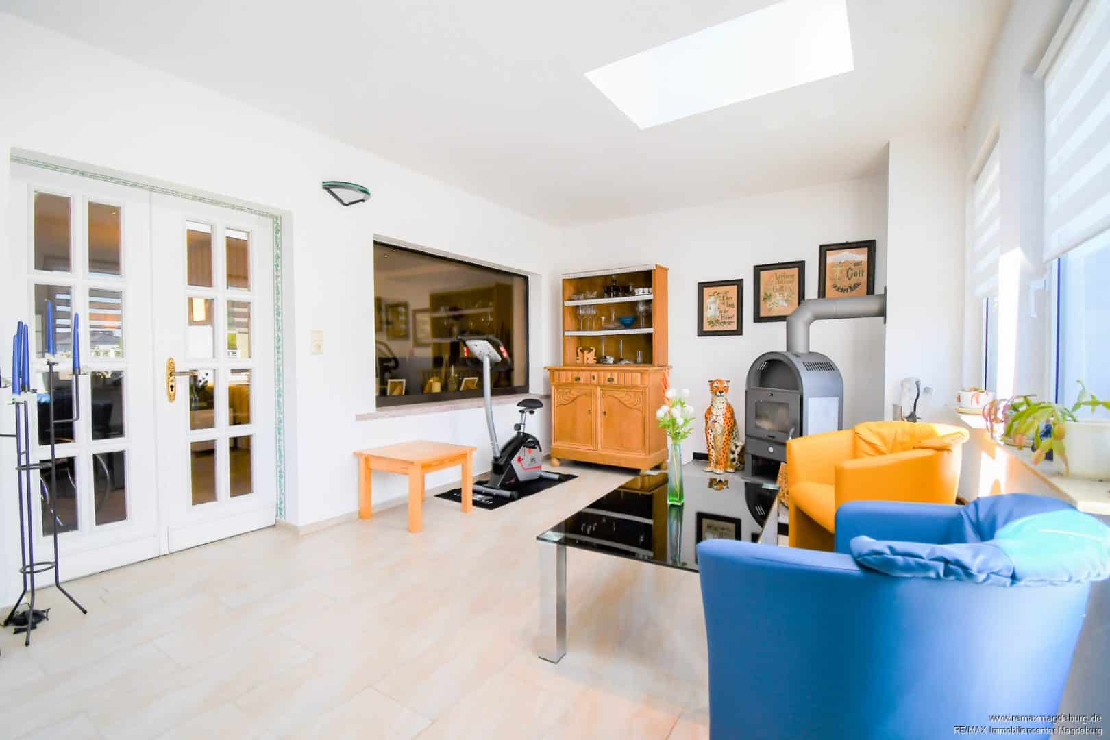 Herz des Hauses ist das gemütliche Wohn- und Esszimmer mit Zugang zum Wintergarten mit Kamin. Von hier aus gelangen Sie auf die ca.