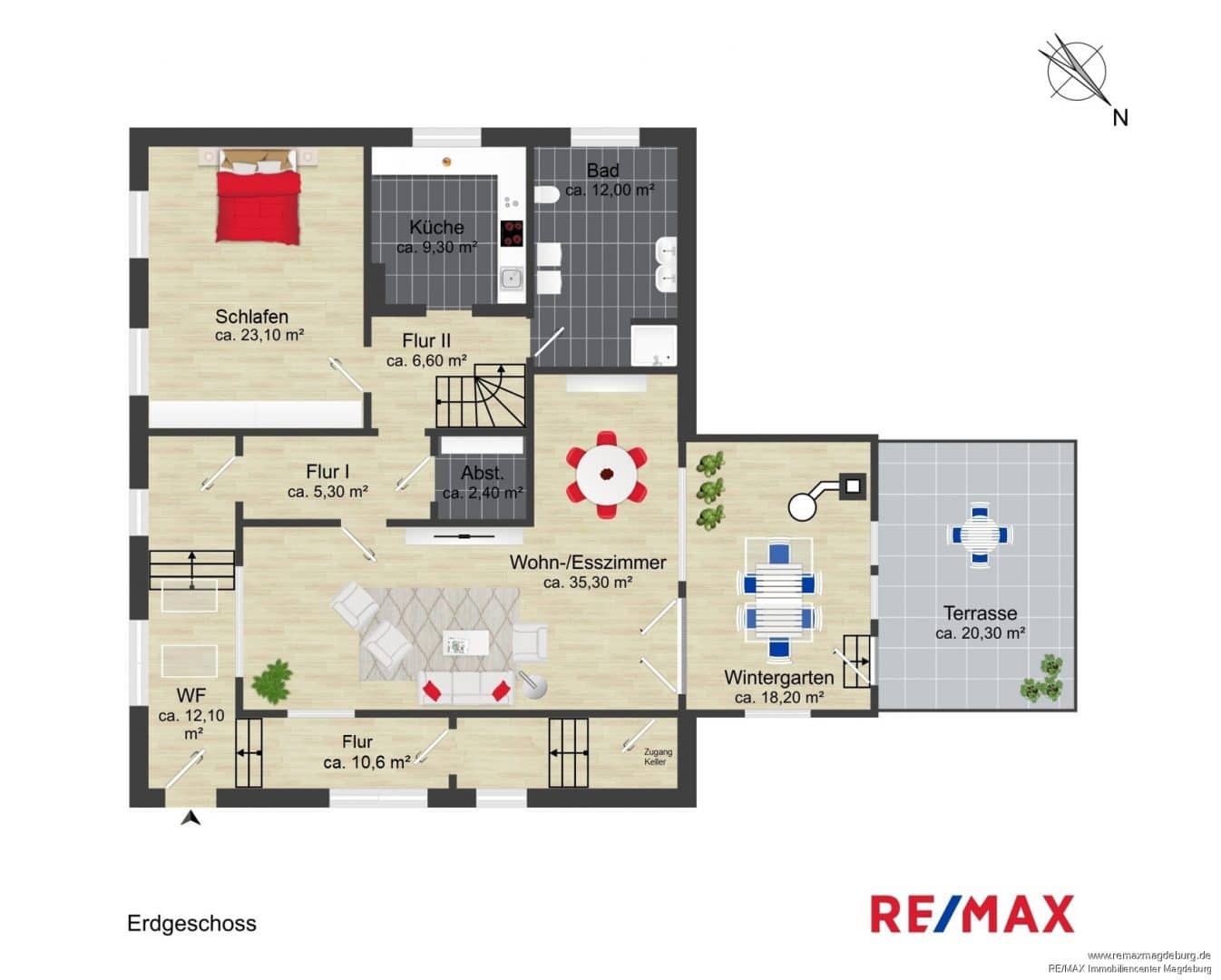 Dank des 462 m² großen Grundstücks besteht die Möglichkeit, zu unterschiedlichen Zeiten des Tages - wenn das Wetter es erlaubt - die Sonne zu genießen. Der große Keller mit vielen Stauflächen und Abstellraum erlaubt unterschiedliche Nutzungsmöglichkeiten.