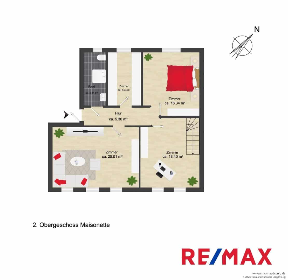 Über eine elegante Treppe gelangt man in das zweite Obergeschoss, das neben einem Badezimmer mit Dusche mehrere flexibel nutzbare Räume bietet. Hier können Sie Schlafzimmer, Kinderzimmer, Wohnzimmer oder ein Büro einrichten.